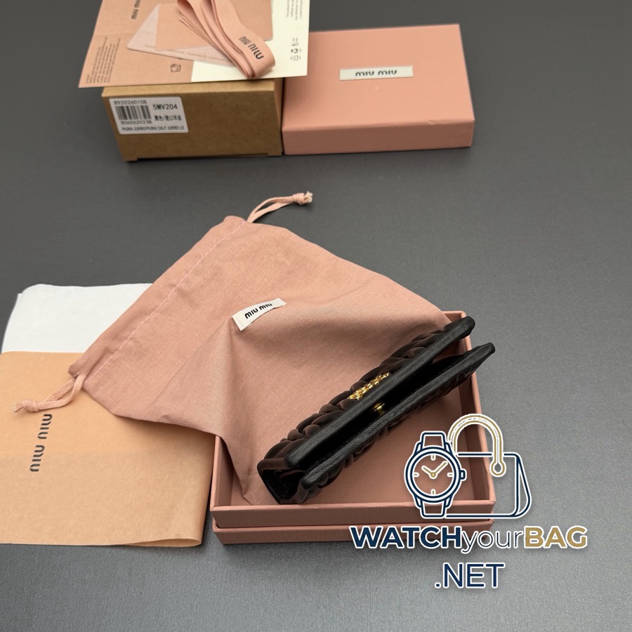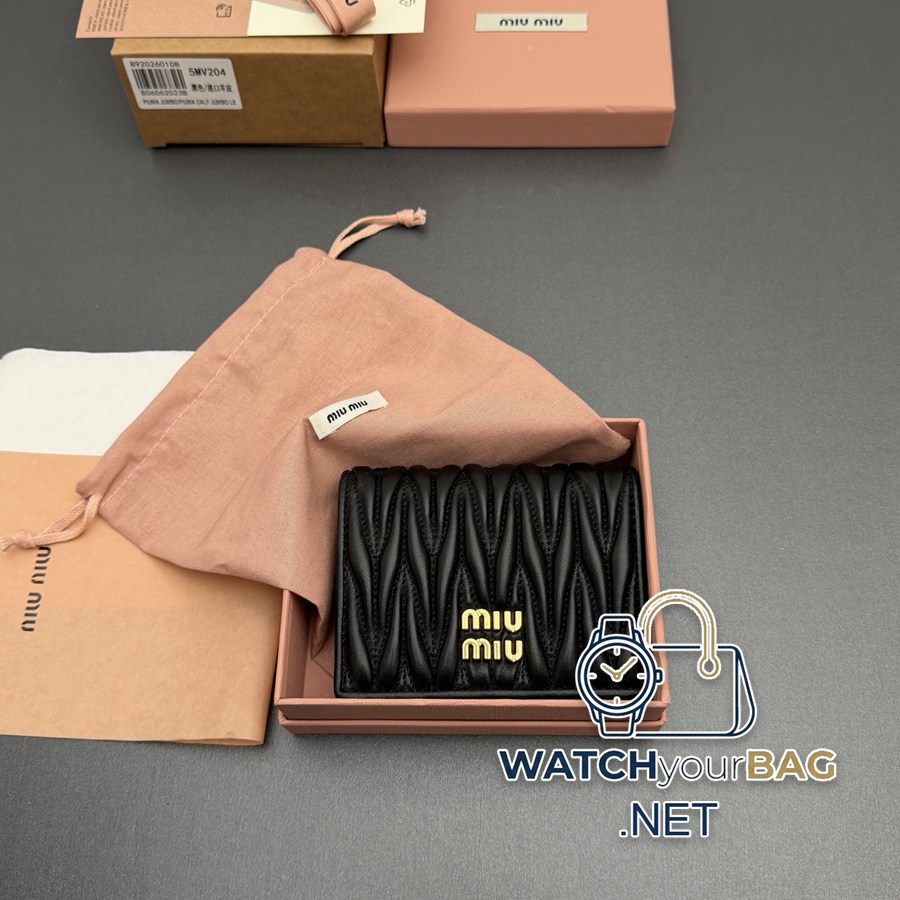 MiuMiu MATELASSÉ Sheep Leather Small Wallet This wallet cleverly creates a 3D effect with a unique texture, and is decorated with a metal lettering logo to fully display the brand style. The spacious interior is equipped with card slots and compartments, highlighting functionality. . Snap closure Metal engraved logo One bill compartment Three card slots Two internal pockets Internal flap coin pocket Lined Reference: 5MV204 Black/Imported sheepskin Dimensions: Width 8.5cm x Height 11.2cm