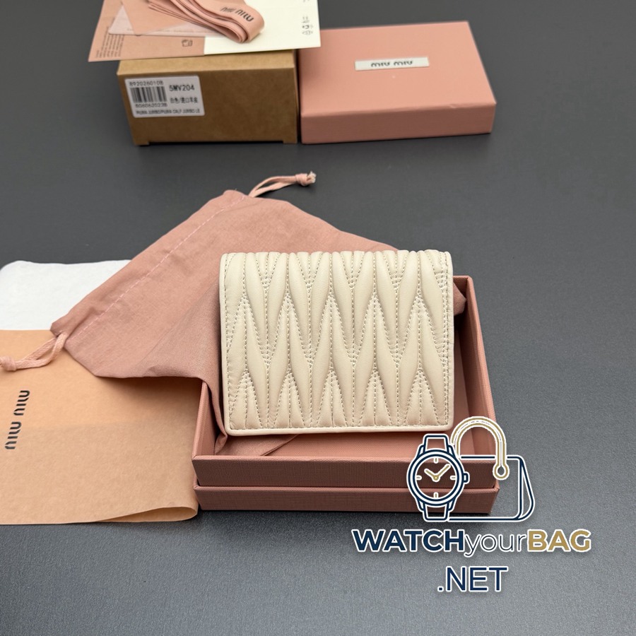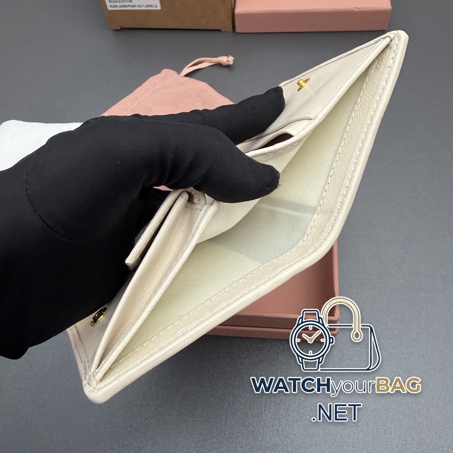 MiuMiu MATELASSÉ Sheep Leather Small Wallet This wallet cleverly creates a 3D effect with a unique texture, and is decorated with a metal lettering logo to fully display the brand style. The spacious interior is equipped with card slots and compartments, highlighting functionality. . Snap closure Metal engraved logo One bill compartment Three card slots Two internal pockets Internal flap coin pocket Lined Reference: 5MV204 White/Imported sheepskin Dimensions: Width 8.5cm x Height 11.2cm