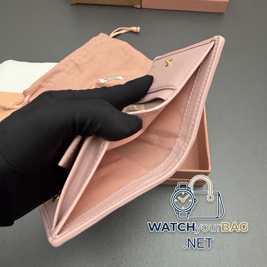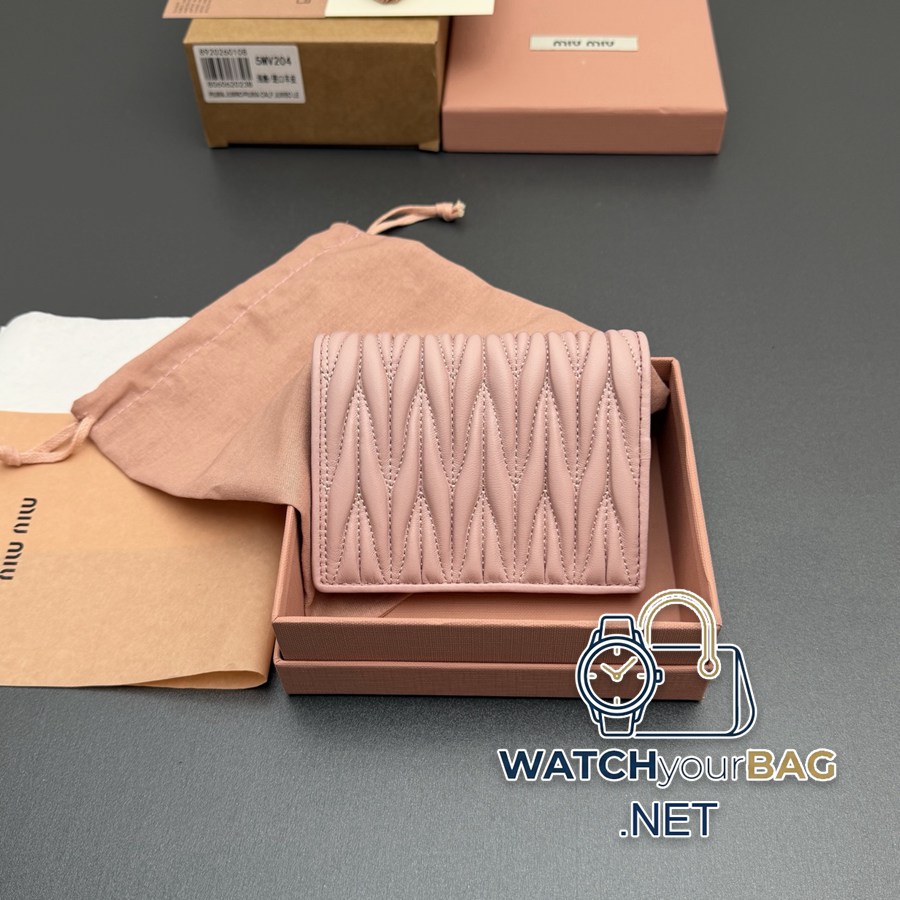 MiuMiu MATELASSÉ Sheep Leather Small Wallet This wallet cleverly creates a 3D effect with a unique texture, and is decorated with a metal lettering logo to fully display the brand style. The spacious interior is equipped with card slots and compartments, highlighting functionality. Snap closure Metal engraved logo One bill compartment Three card slots Two internal pockets Internal flap coin pocket Lined Reference number: 5MV204 Light pink/Imported sheepskin Dimensions: Width 8.5cm x Height 11.2cm