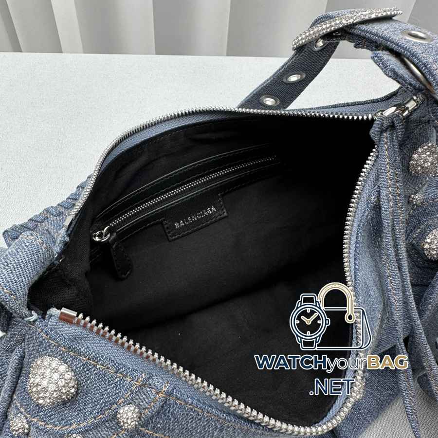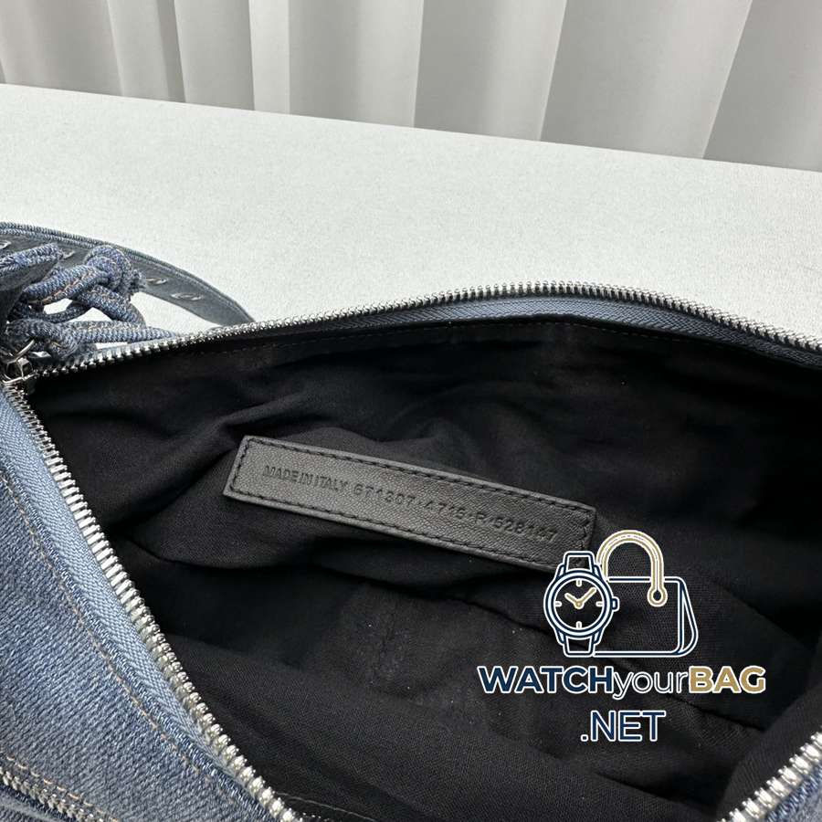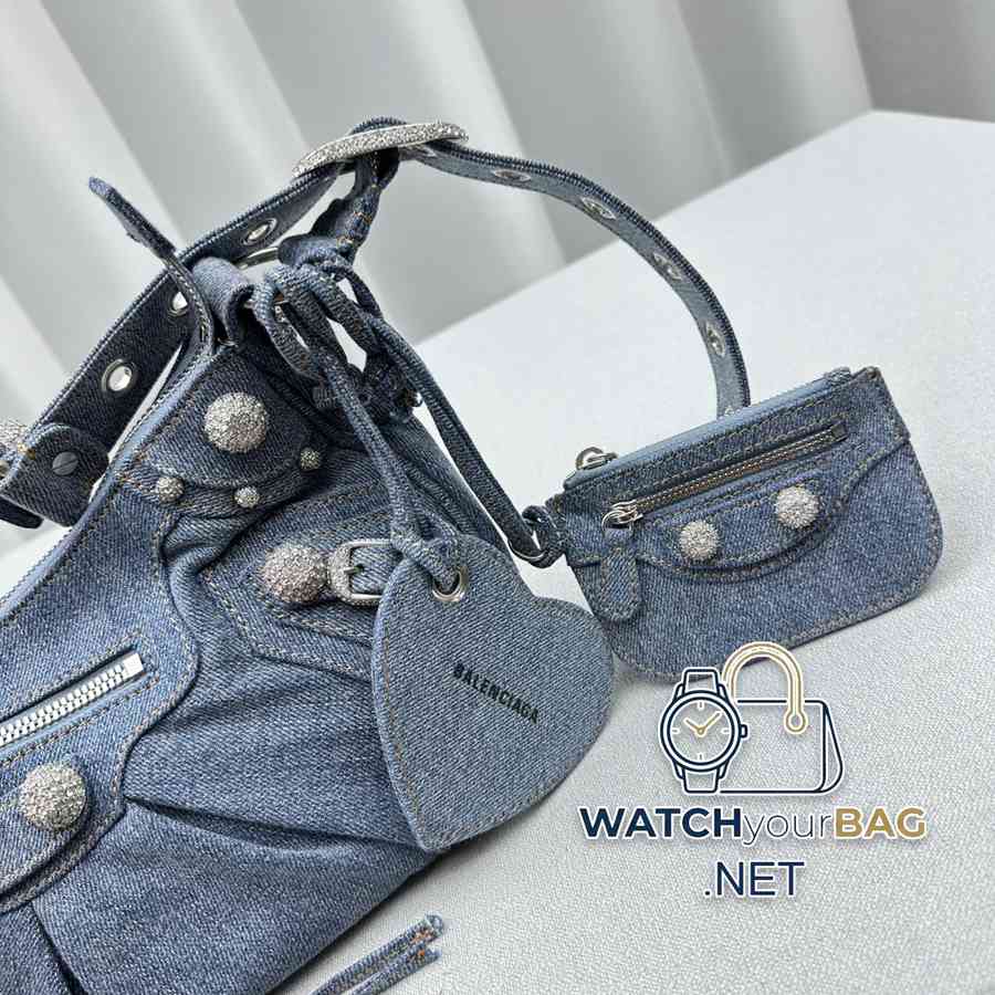 Large/diamond denim blue Balenciag Le Cagole half-moon armpit bag/crossbody bag ~ improved on the traditional motorcycle bag. Adjustable woven shoulder strap with additional eyelets and external leather card holder, heart-shaped hanging mirror ♡ It follows the classic motorcycle elements. Small and exquisite design, various carrying methods and the design of each texture is really great, full of high-end feeling and super casual atmosphere. The bag that makes me excited, boys and girls carry it really well, the really fragrant series, I have to take it off first haha Style number: 92718 Large size: length 33X height 16X width 8.4CM