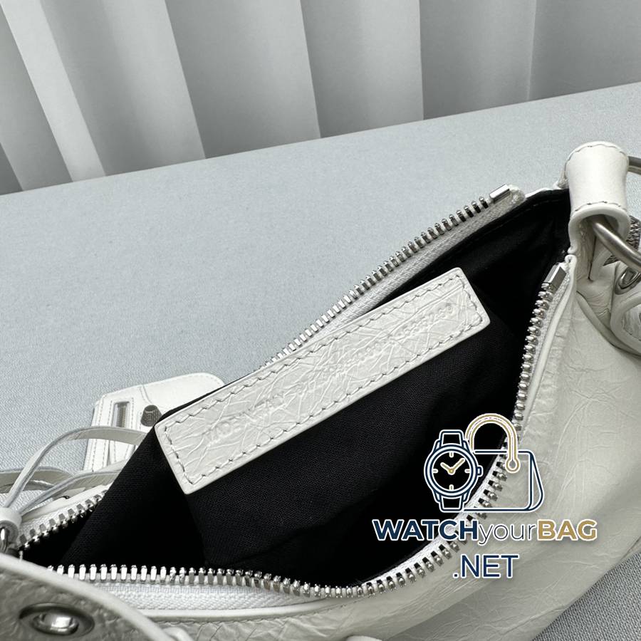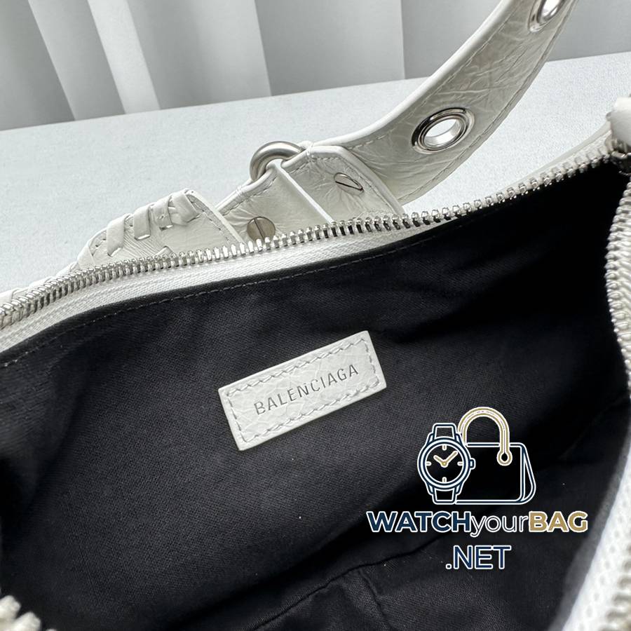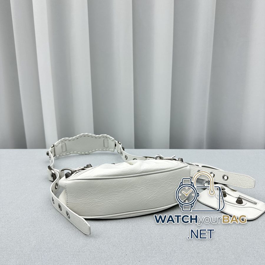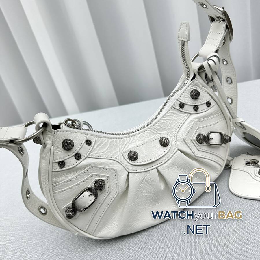 Small oily white Balenciag Le Cagole half-moon armpit/crossbody bag ▫️Improved on the traditional motorcycle bag, the adjustable woven shoulder strap has additional eyelets and an external leather card holder, and a heart-shaped hanging mirror ♡It follows the classic motorcycle elements. The small and exquisite design, various carrying methods, and the design of each texture is really great, the upper body is full of high-end and super casual and elegant! Style number: 92718 Small size: length 26X height 16X width 10CM Large size: length 33X height 16X width 8.4CM