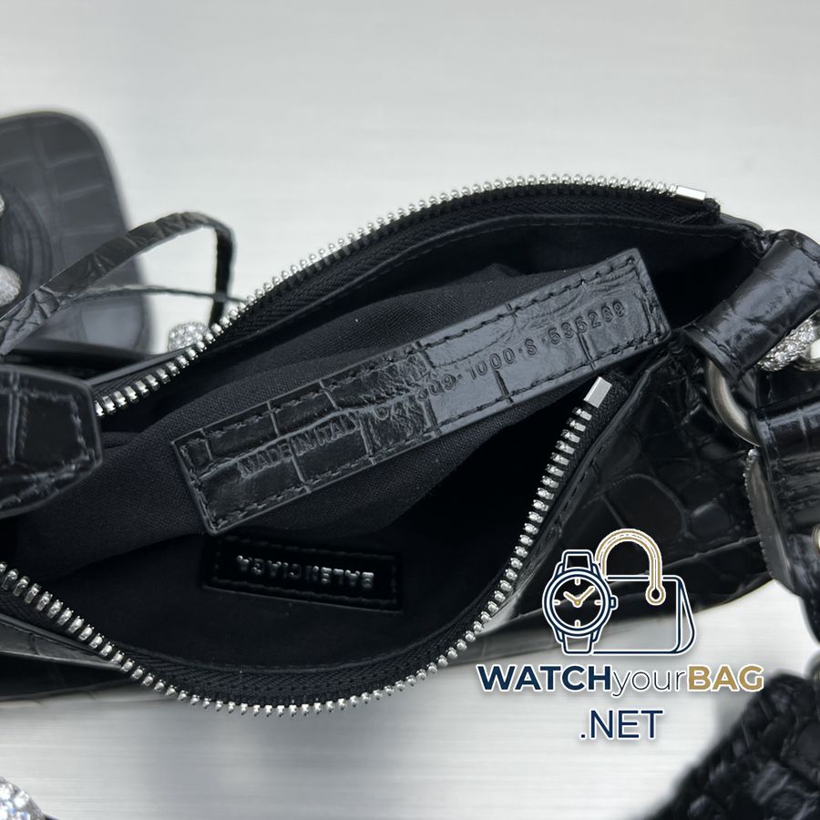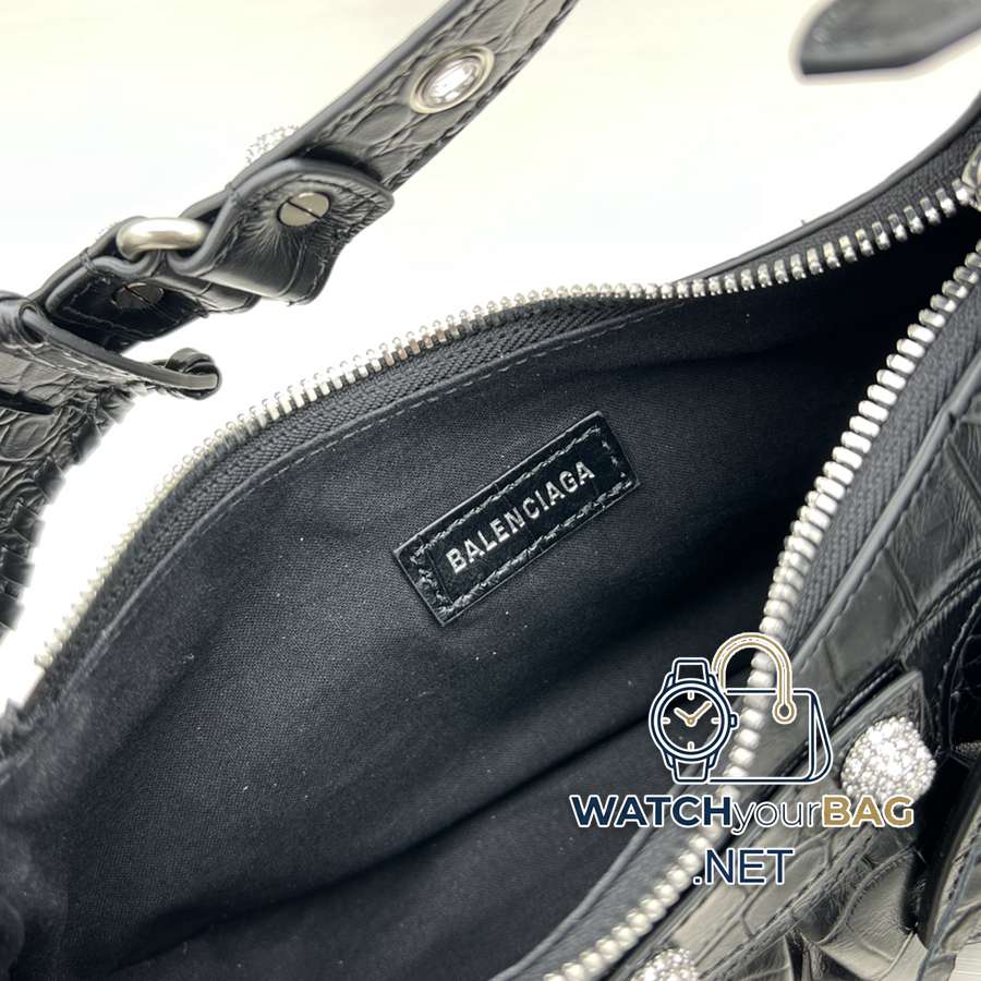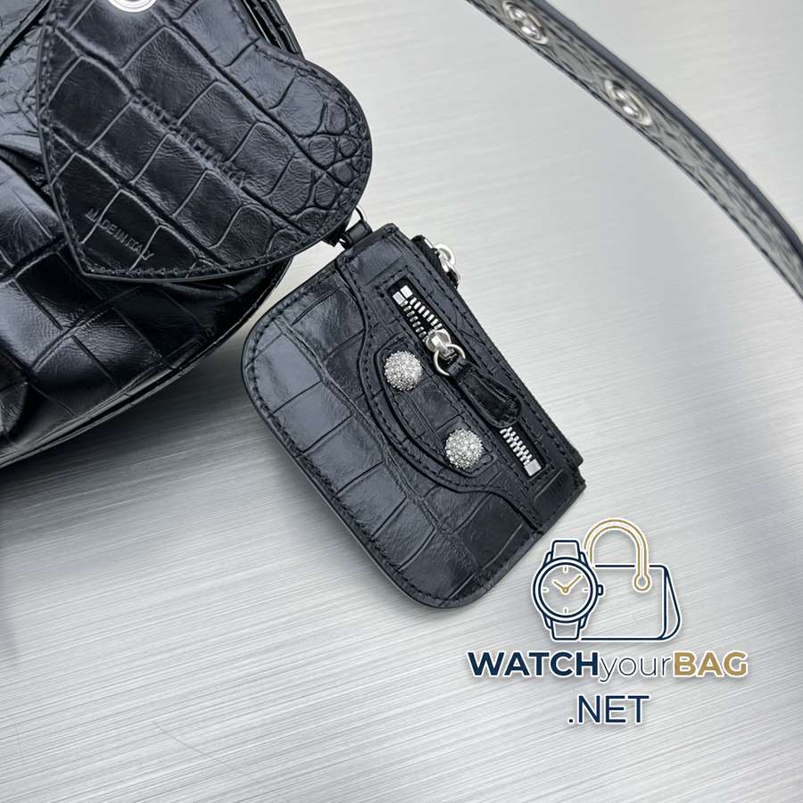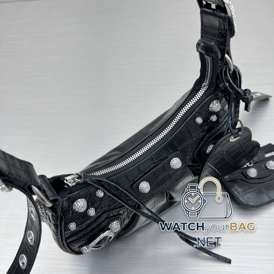 Small crocodile black/dazzling diamond Balenciag Le Cagole half-moon armpit/crossbody bag ▫️Improved on the traditional motorcycle bag. Adjustable woven shoulder strap with additional eyelets and external leather card holder, heart-shaped hanging mirror ♡Follow the classic motorcycle elements. Small and exquisite design, various carrying methods, and the design of each texture is really great. The upper body is full of high-end and super casual and elegant! Style number: 92718 Small size: length 26X height 16X width 10CM