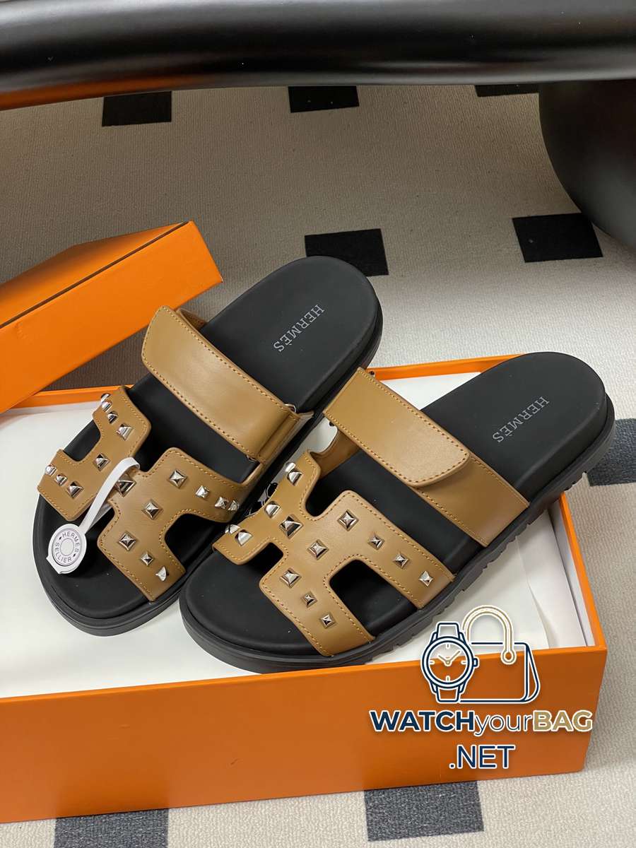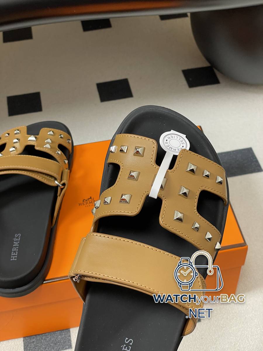 Hermes Cheryp Classic Second Uncle Slippers H-shaped Velcro Flat Bottom Second Uncle Sandals Couple Style Casual Lazy Shoes Studded Thick-soled Sandals Slippers Various colors of genuine leather cut into geometric H shapes, designed uppers, exuding elegance and charm. Functional leather sandal with ergonomic rubber sole and adjustable straps. Decorated with classic Medor rivets. The design is simple and smooth, creating a comfortable and casual look. Upper: cowhide/open mold rivets Sole: original open mold TPU anti-slip outsole Size: Female 35-39 (40.41 customized, non-returnable) Male 39-44 (38.45 customized, non-refundable)