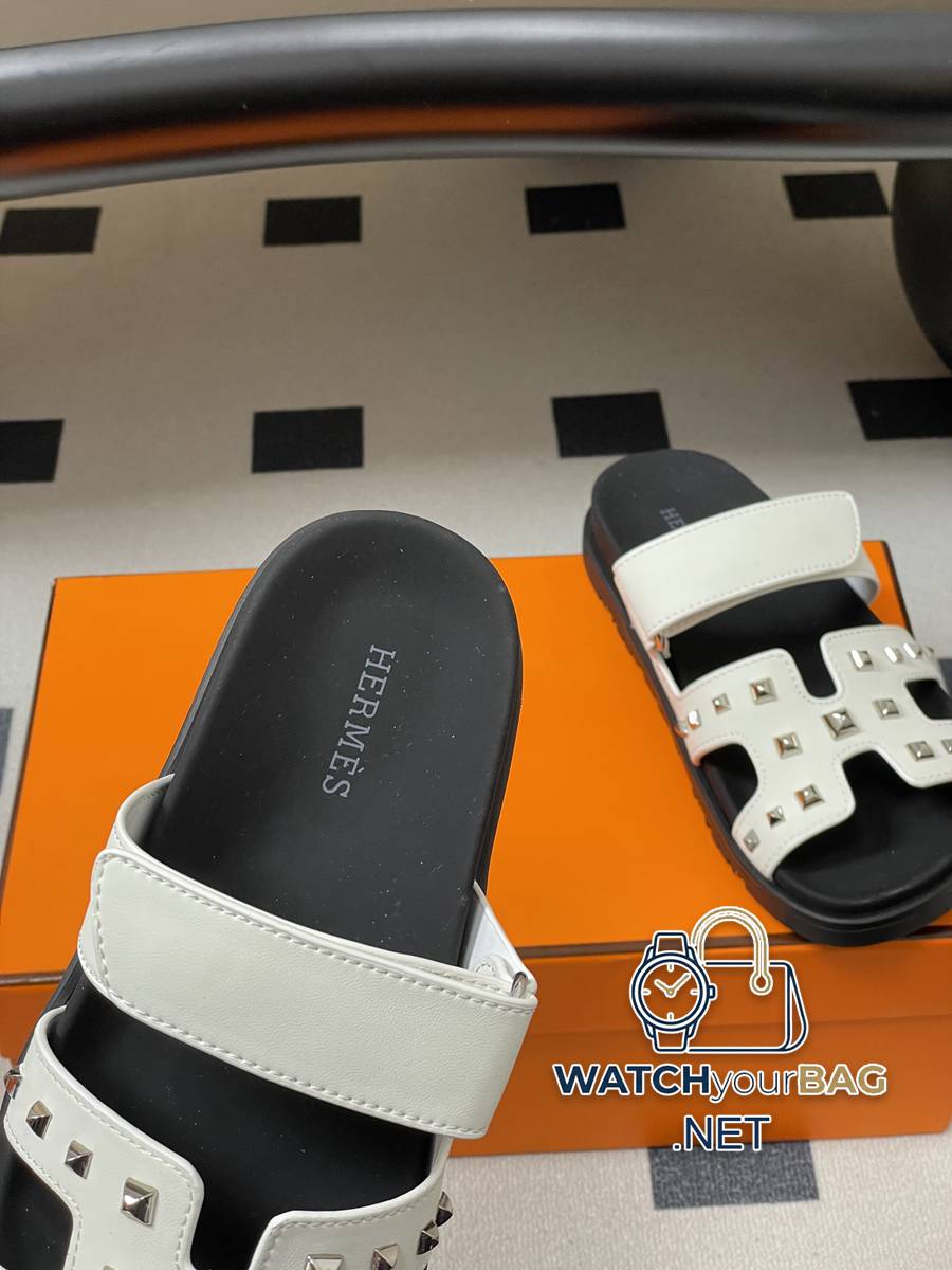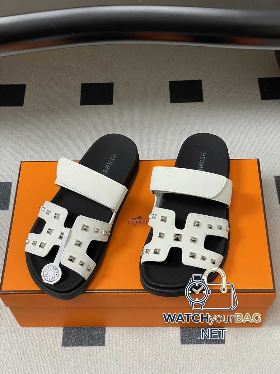 Hermes Cheryp Classic Second Uncle Slippers H-shaped Velcro Flat Bottom Second Uncle Sandals Couple Style Casual Lazy Shoes Studded Thick-soled Sandals Slippers Various colors of genuine leather cut into geometric H shapes, designed uppers, exuding elegance and charm. Functional leather sandal with ergonomic rubber sole and adjustable straps. Decorated with classic Medor rivets. The design is simple and smooth, creating a comfortable and casual look. Upper: cowhide/open mold rivets Sole: original open mold TPU anti-slip outsole Size: Female 35-39 (40.41 customized, non-returnable) Male 39-44 (38.45 customized, non-refundable)
