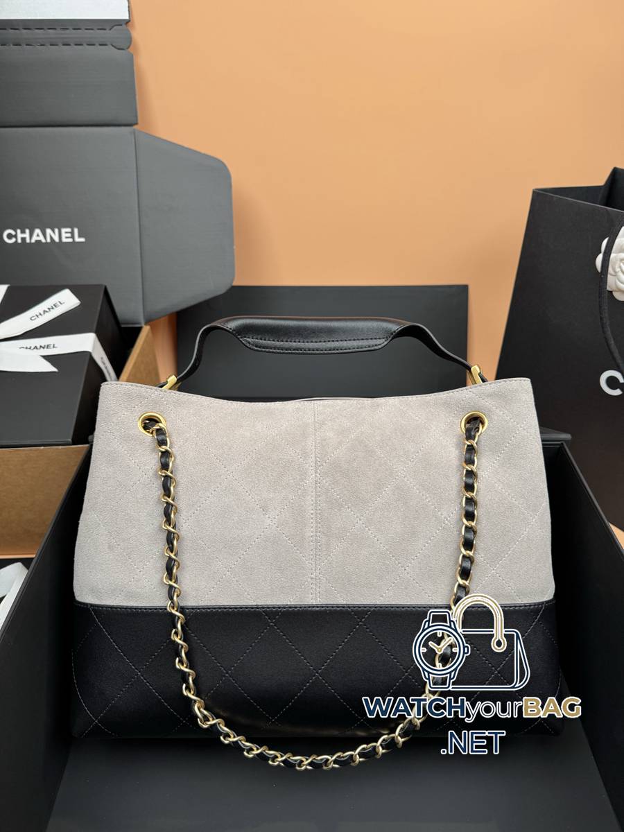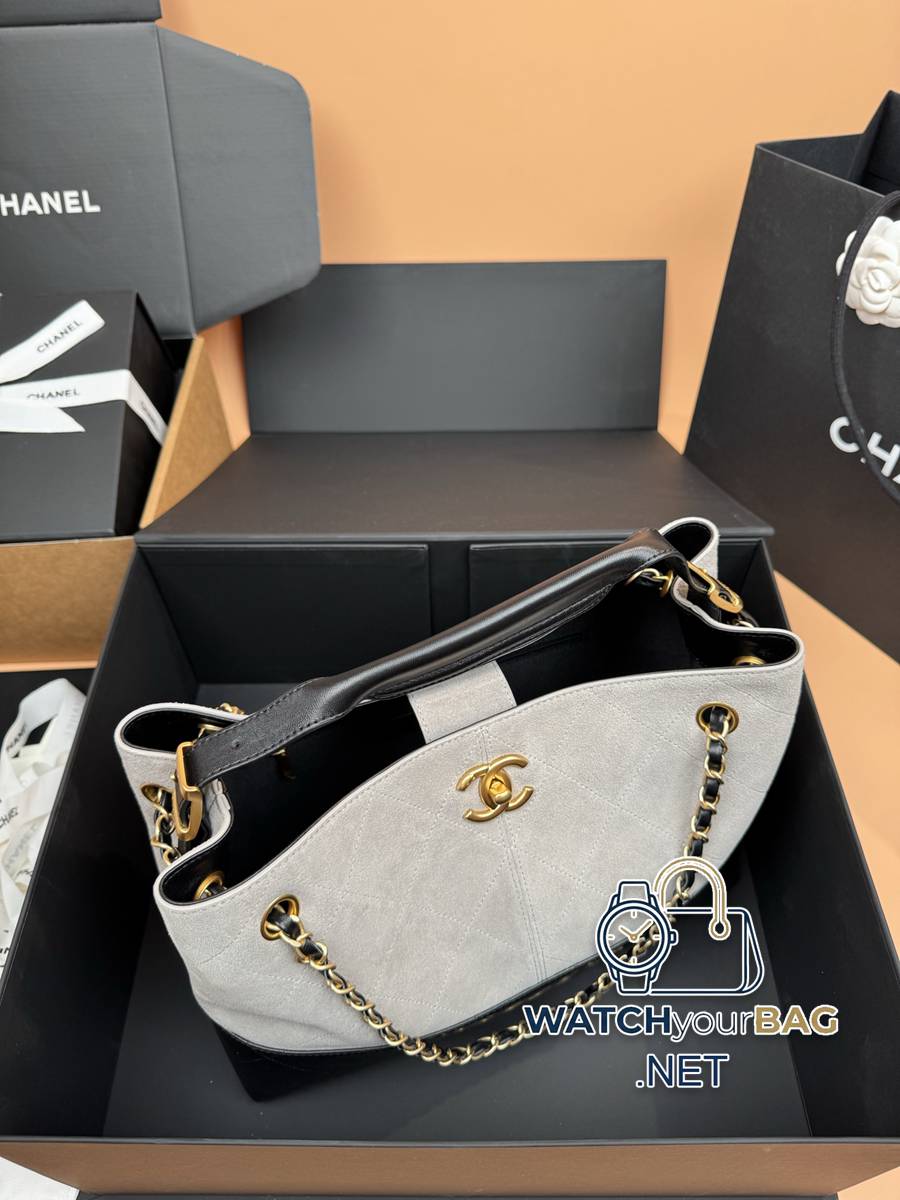 25AHobo shopping bag series: medium horizontal style, integrating fashion and classic, never out of style. Classic diamond quilted leather: original imported gray and white suede and black lambskin. Hardware: gilt. Size: w36×h24×d12cm. Model: 5634 gray and white suede and gilt. No packaging included.