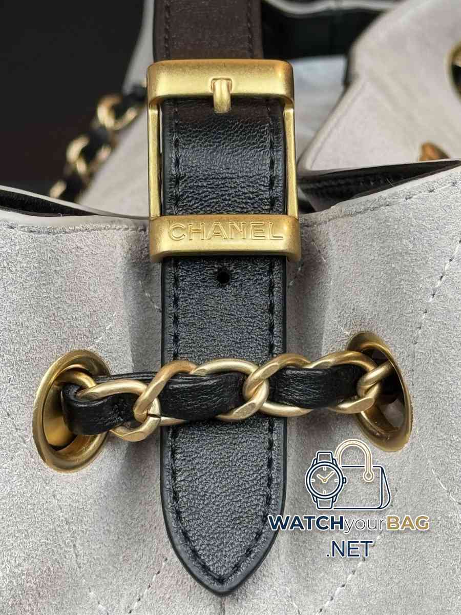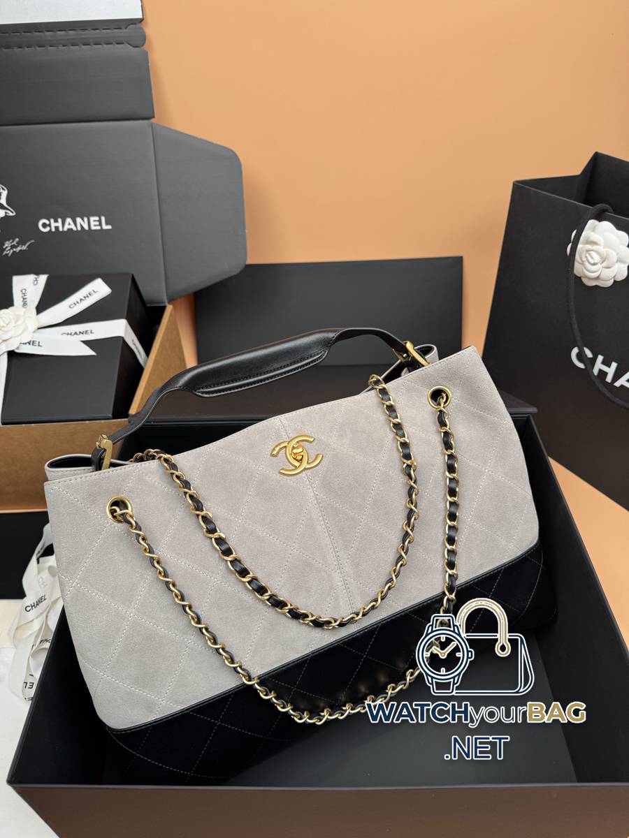 25AHobo shopping bag series: large horizontal style that combines fashion and classics, never goes out of style. Classic diamond quilted leather: imported off-white suede and black lambskin. Hardware: gilt. Size: w39×h37×h14cm. Model: 5657 off-white suede gilt. No packaging included.