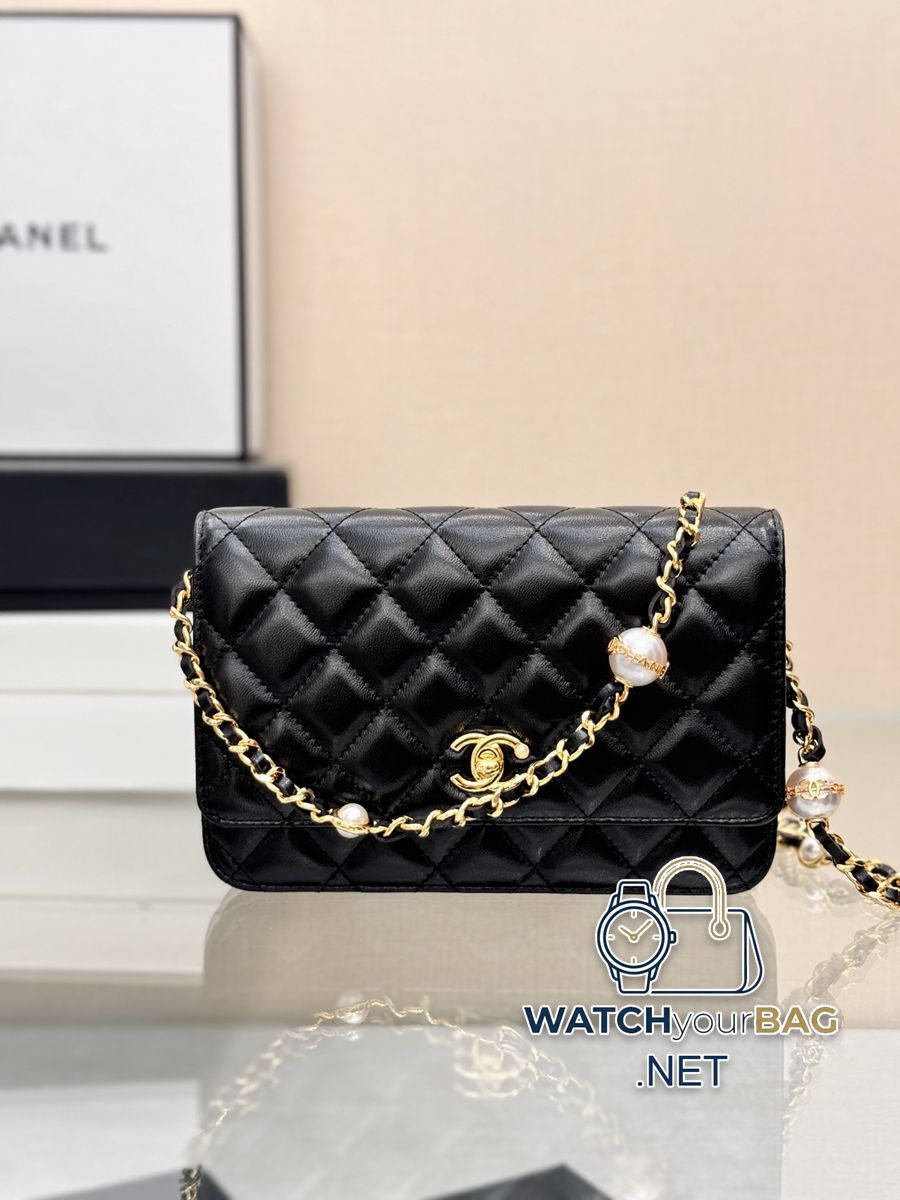 Pearl chain bag WOC, the latest 24K new beads are really absolutely beautiful! It is an exquisite double-layered classic WOC bag that looks like a work of art. It has a large capacity and can accommodate 2 bags. It is very practical and has a unique design with a double C buckle strap. It has a blingbling feeling. It is so exquisite and rice-cake skin is very unique! It feels very durable! Paired with any clothes, it will make you sophisticated. Size: 19cm Model: 4282