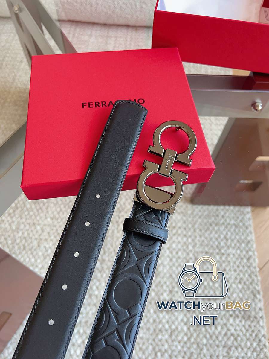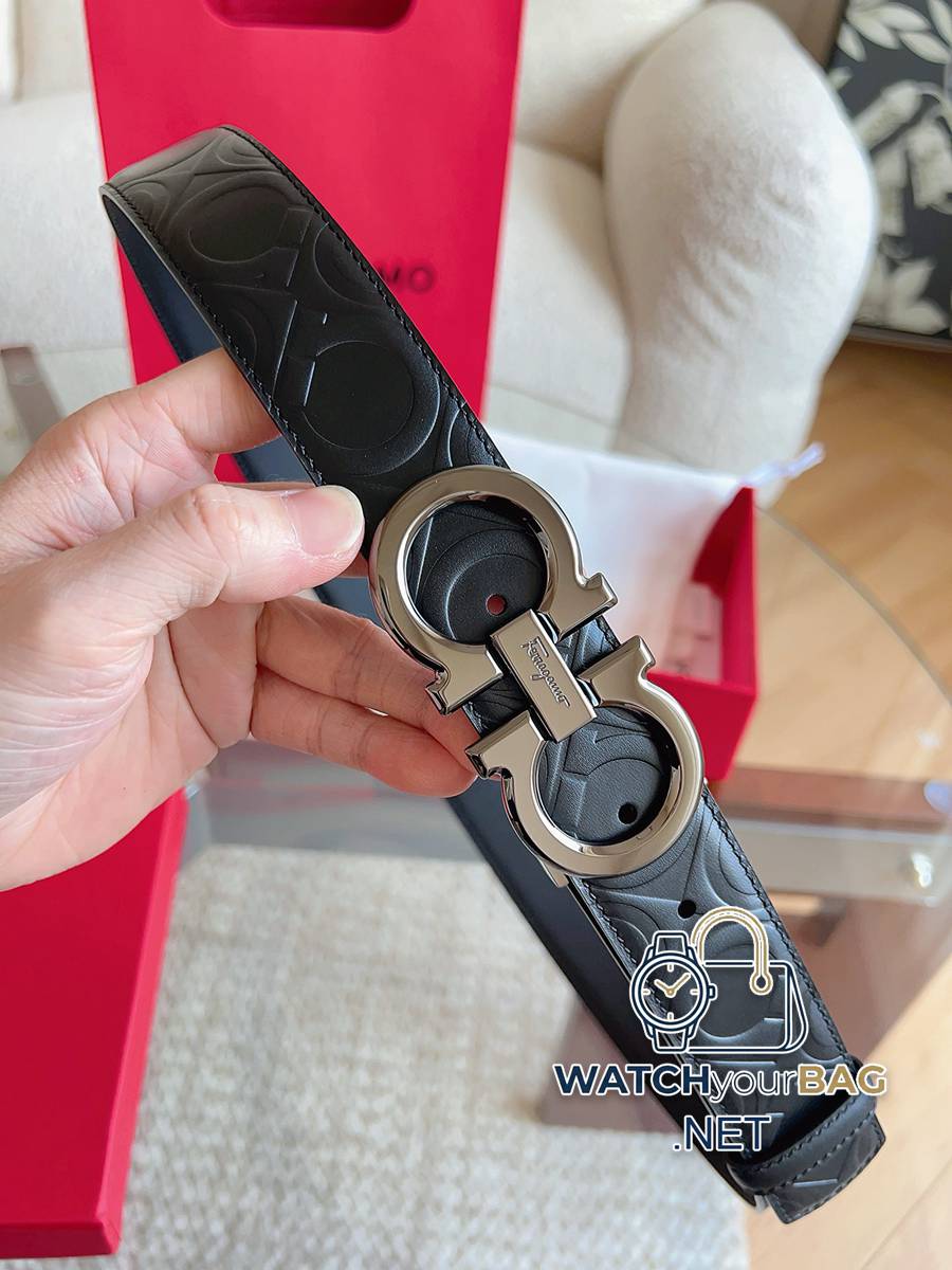 Ferragamo (early spring 2026) men belt 3.5cm. The belt is made of top-grain cowhide with special processing to highlight the natural grain. Modern and elegant colors are used to reinterpret men classic items. The double-sided design complements the Gancini double buckle to create a flexible and versatile piece. The length is adjustable to achieve a tailor-made slimming effect.