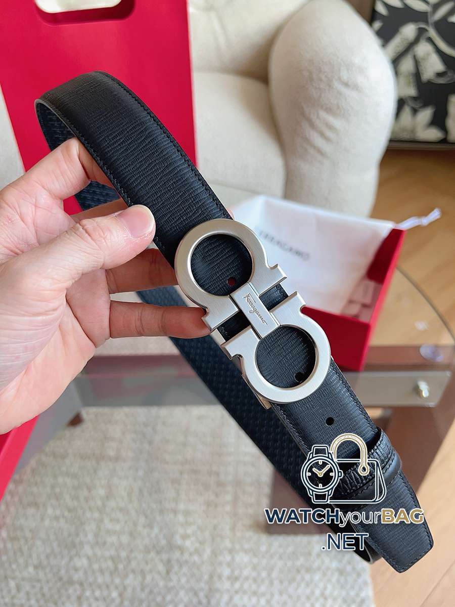 Ferragamo (early spring 2026) men belt 3.5cm. The belt is made of top-grain cowhide with special processing to highlight the natural grain. Modern and elegant colors are used to reinterpret men classic items. The double-sided design complements the Gancini double buckle to create a flexible and versatile piece. The length is adjustable to achieve a tailor-made slimming effect.