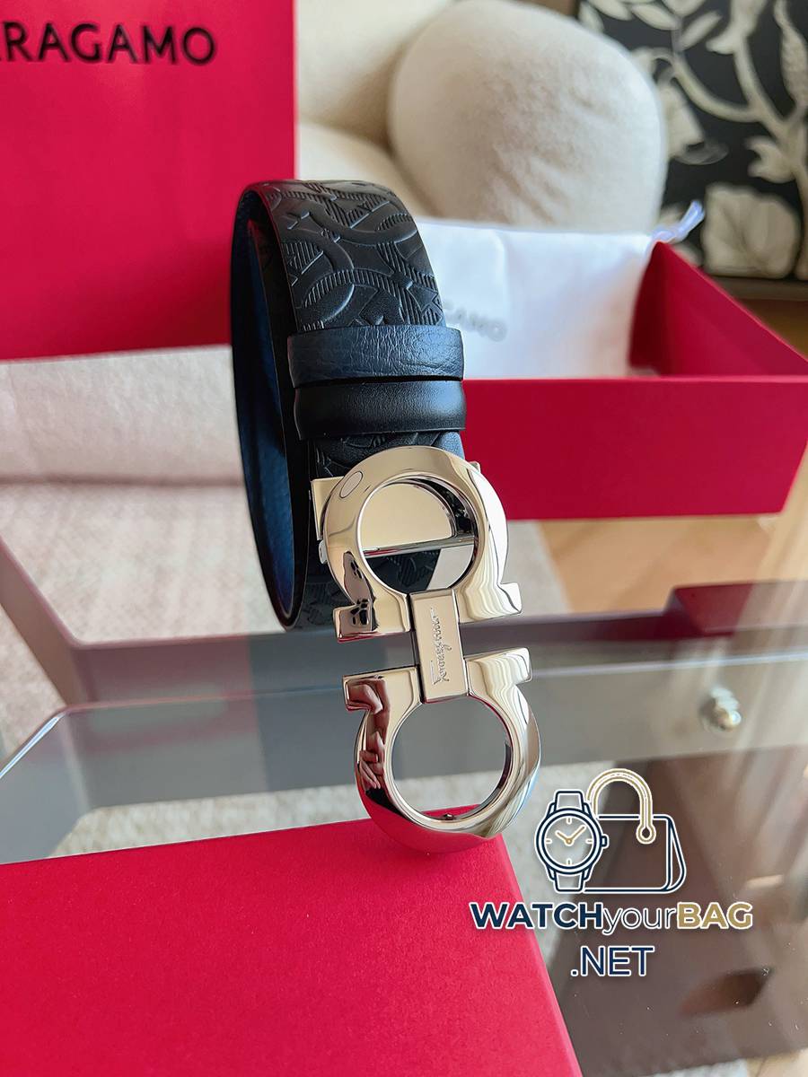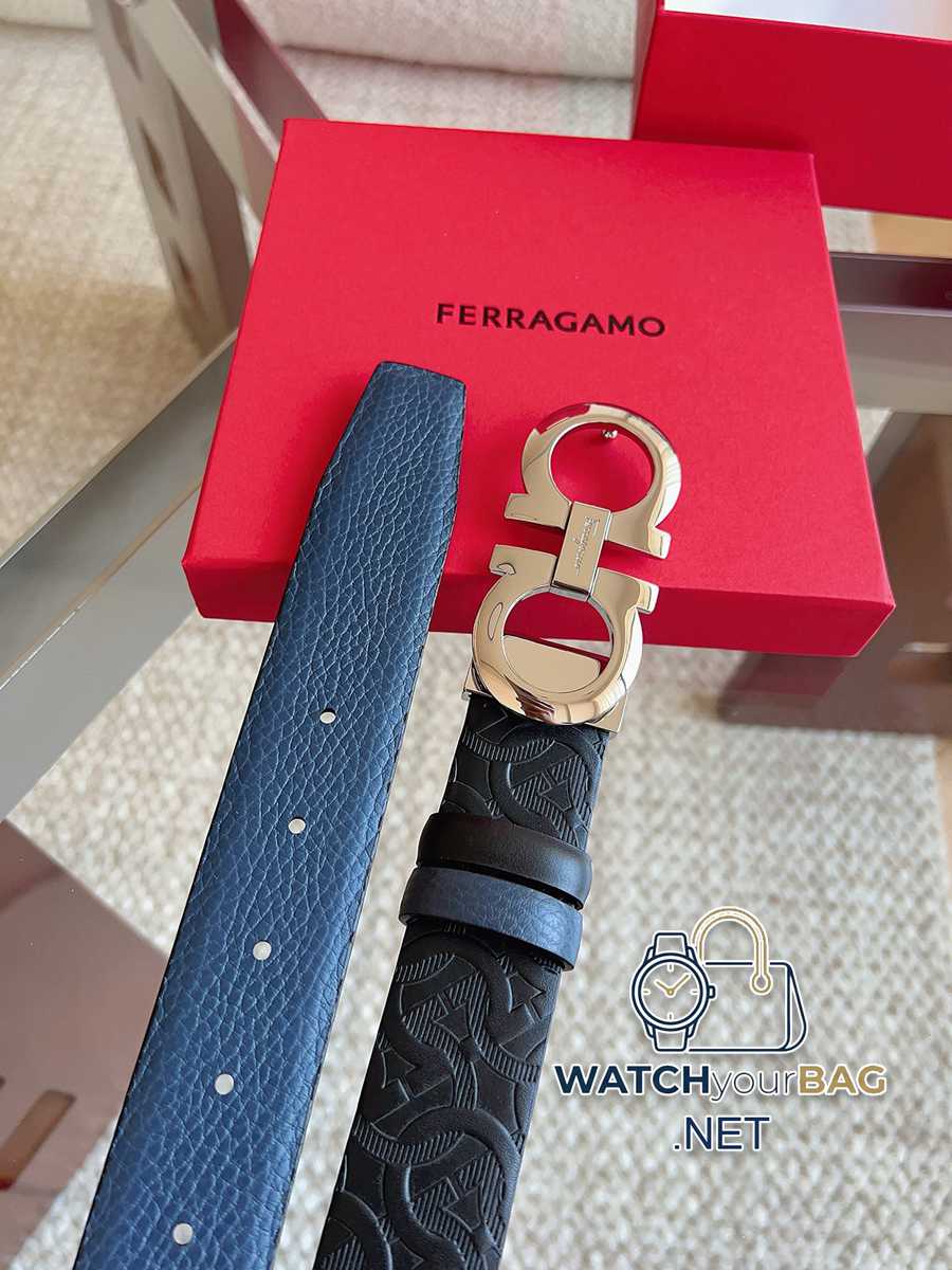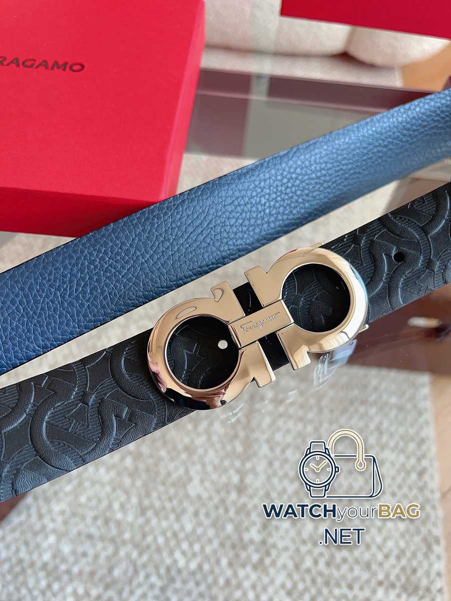 Ferragamo (early spring 2026) men belt 3.5cm. The belt is made of top-grain cowhide with special processing to highlight the natural grain. Modern and elegant colors are used to reinterpret men classic items. The double-sided design complements the Gancini double buckle to create a flexible and versatile piece. The length is adjustable to achieve a tailor-made slimming effect.
