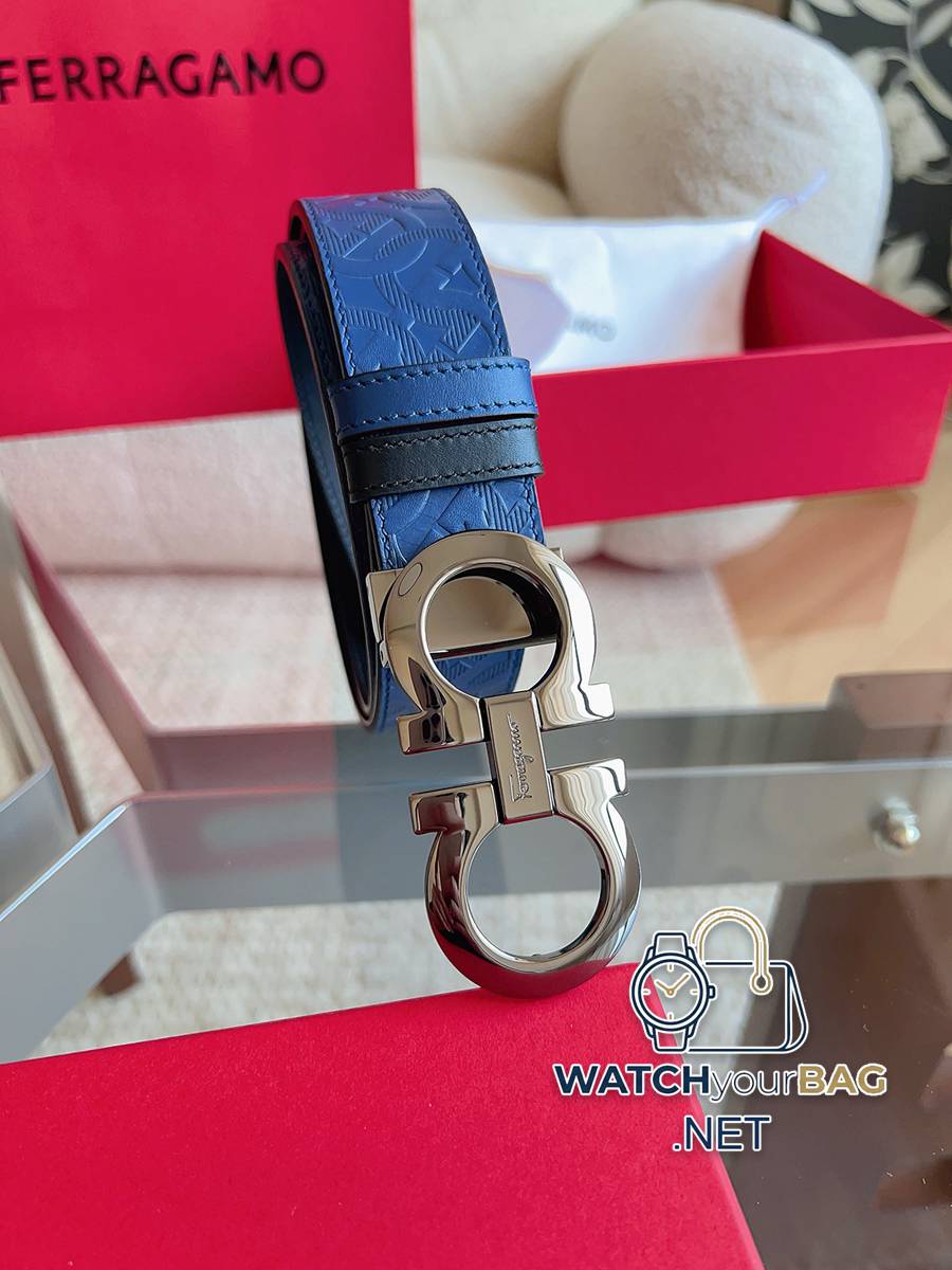 Ferragamo (early spring 2026) men belt 3.5cm. The belt is made of top-grain cowhide with special processing to highlight the natural grain. Modern and elegant colors are used to reinterpret men classic items. The double-sided design complements the Gancini double buckle to create a flexible and versatile piece. The length is adjustable to achieve a tailor-made slimming effect.