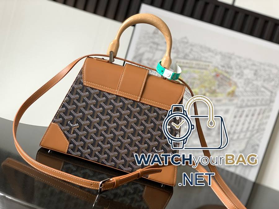 The Saïgon bag is one of the iconic pieces of the House of Goyard, embodying all the characteristic elements of the brand’s boxmaking craftsmanship, such as wood, strips, leather corners and tacks. The Saigon Small Bag features a structured design and a removable shoulder strap for a chic and elegant look. 20 cm x 12 cm x 28 cmLAR 020186-Black/Brown