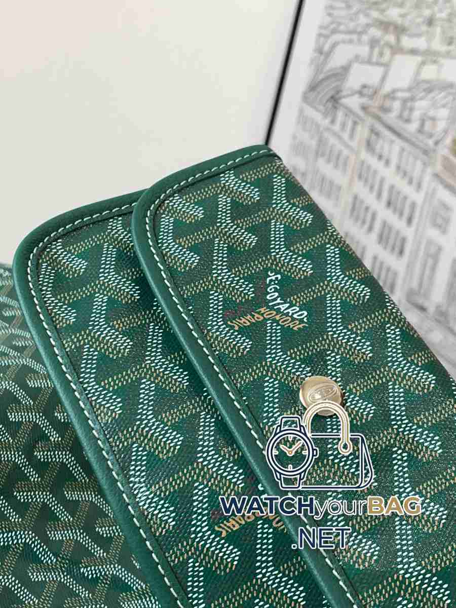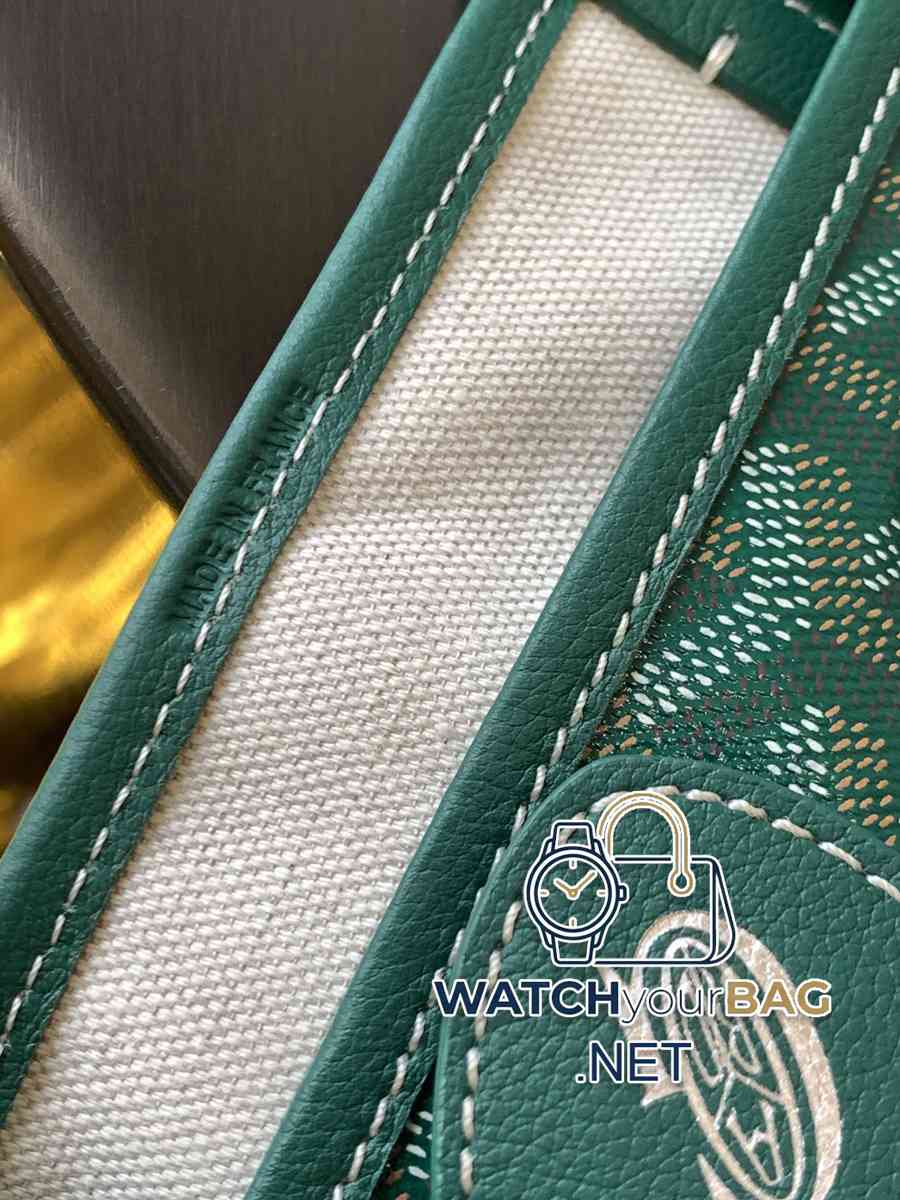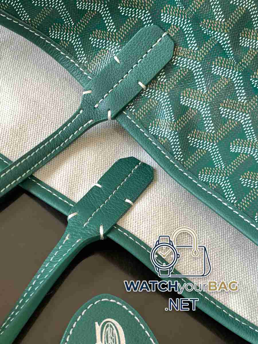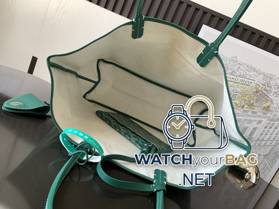 Saint Louis small shopper bag in Goyardine canvas, unlined, soft and lightweight, reversible, with Goyardine canvas on the front and cotton and linen knit on the other. The two leather handles change from thin to thick, supporting multiple carrying methods. It features a removable interior pocket that hangs from one of the bag’s handles for quick access. 28 cm x 15 cm x 34 cm020146M-Green