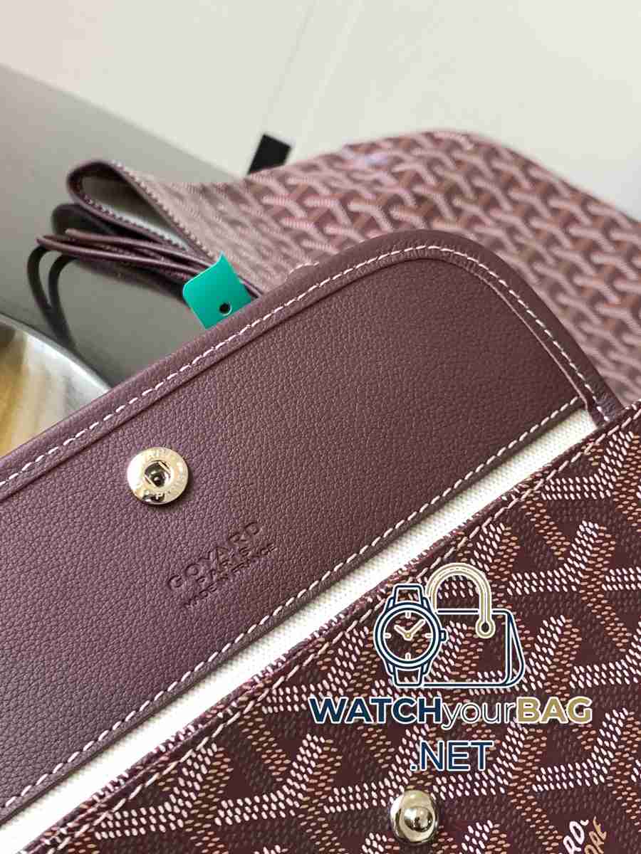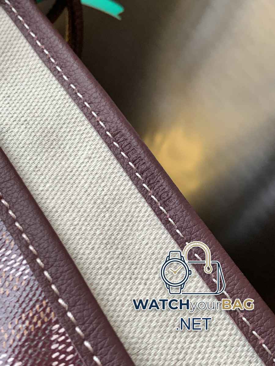 Saint Louis small shopper bag in Goyardine canvas, unlined, soft and lightweight, reversible, with Goyardine canvas on the front and cotton and linen knit on the other. The two leather handles change from thin to thick, supporting multiple carrying methods. It features a removable interior pocket that hangs from one of the bag’s handles for quick access. 28 cm x 15 cm x 34 cm020146M-maroon