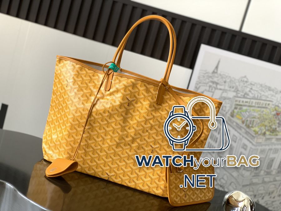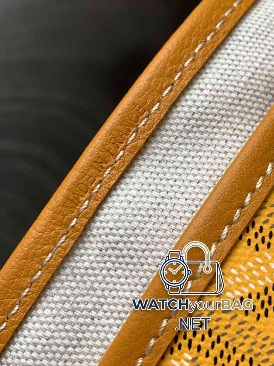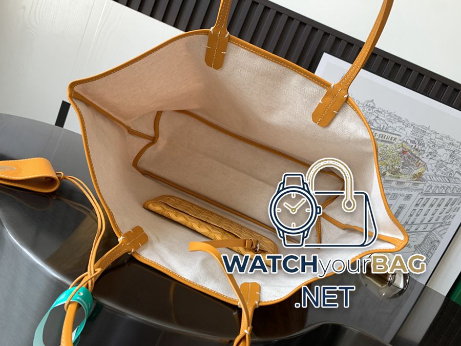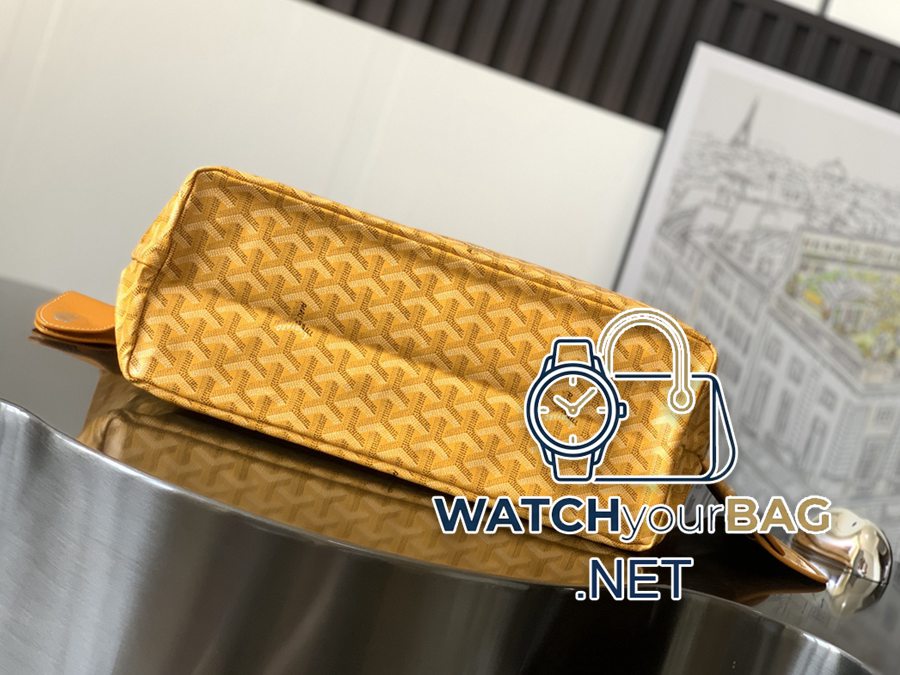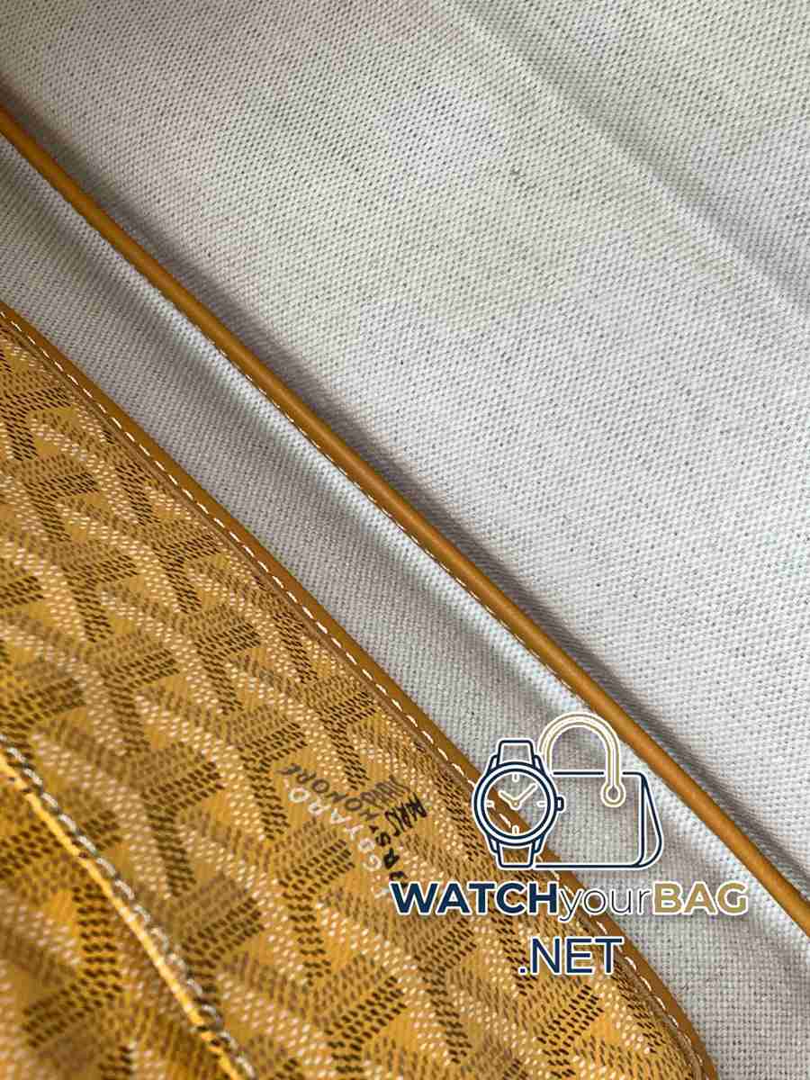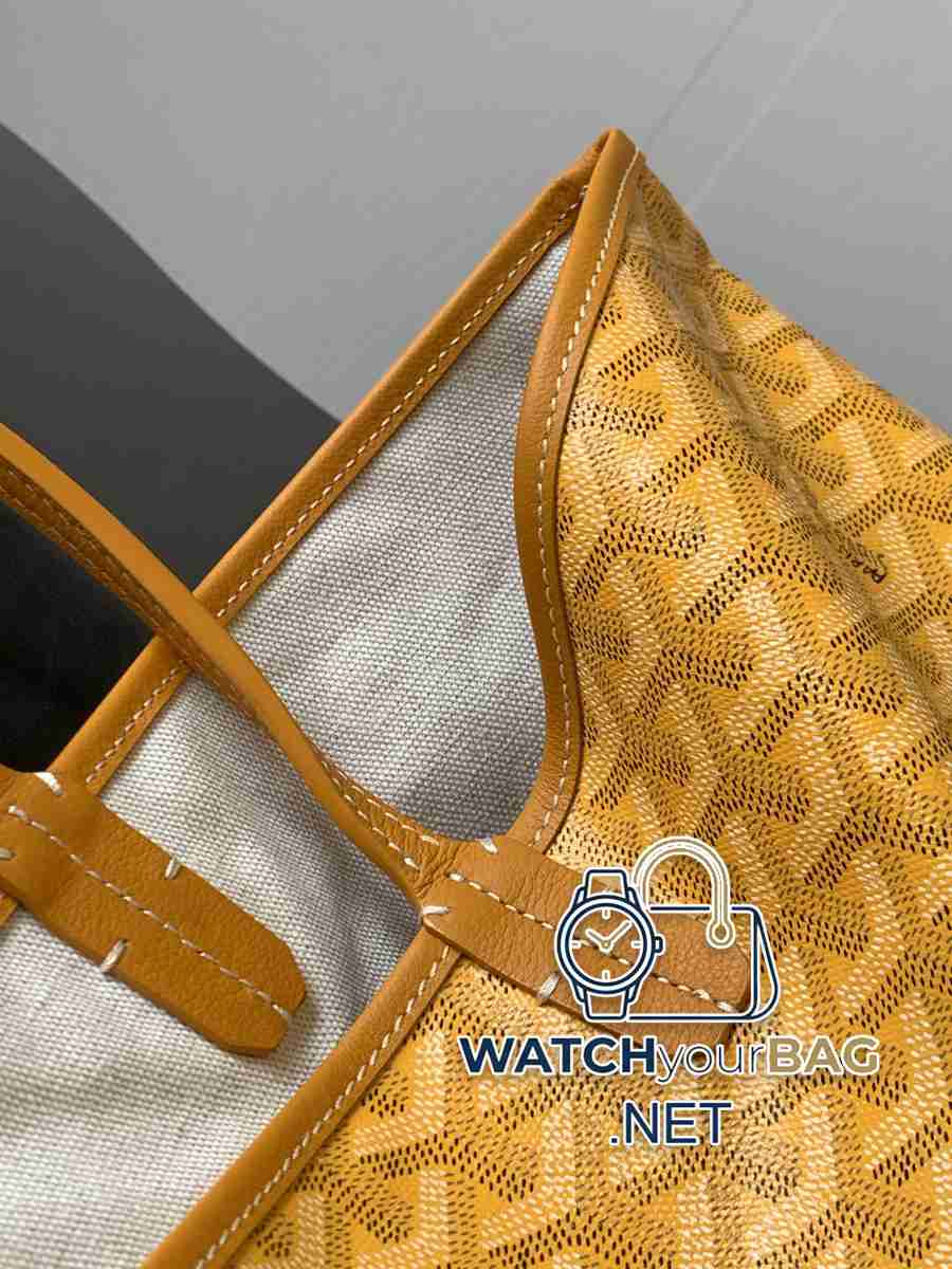 Saint Louis small shopper bag in Goyardine canvas, unlined, soft and lightweight, reversible, with Goyardine canvas on the front and cotton and linen knit on the other. The two leather handles change from thin to thick, supporting multiple carrying methods. It features a removable interior pocket that hangs from one of the bag’s handles for quick access. 28 cm x 15 cm x 34 cm020146M-yellow