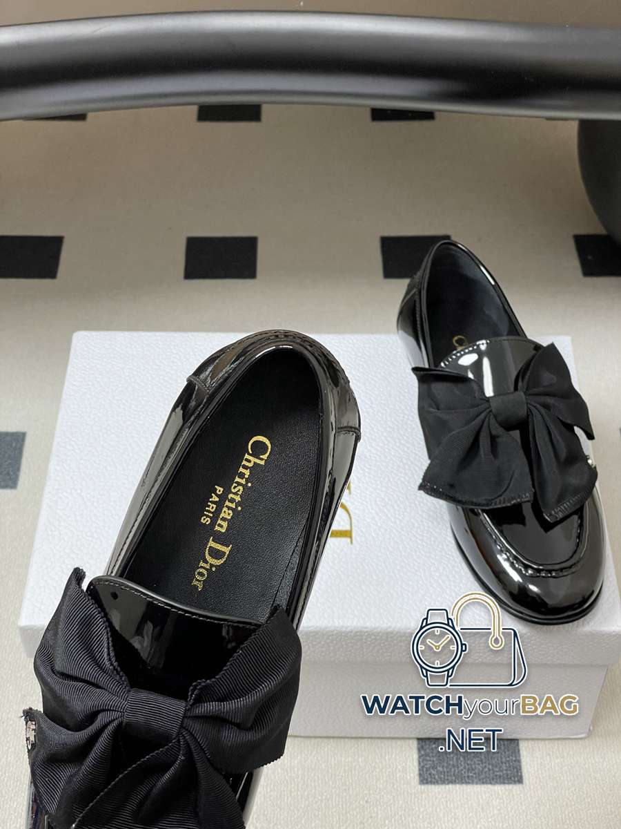 26ss spring and summer new Dior D-Boy big bow loafers CD letter buckle flat slip-on shoes. This Dior Boy loafer is a new product in the 2025 autumn series, showing the charm of high-end customization. The black patent cow leather upper is equipped with an almond-shaped toe design, decorated with an oversized black grosgrain bow, and is embellished with a gold-finished metal CD logo to enhance the style. It adds elegance to any seasonal look. Upper: cow patent leather/cowhide lining Feet: sheepskin Sole: Italian genuine leather Outsole Size: 35-39 (40.41 customized, non-returnable)