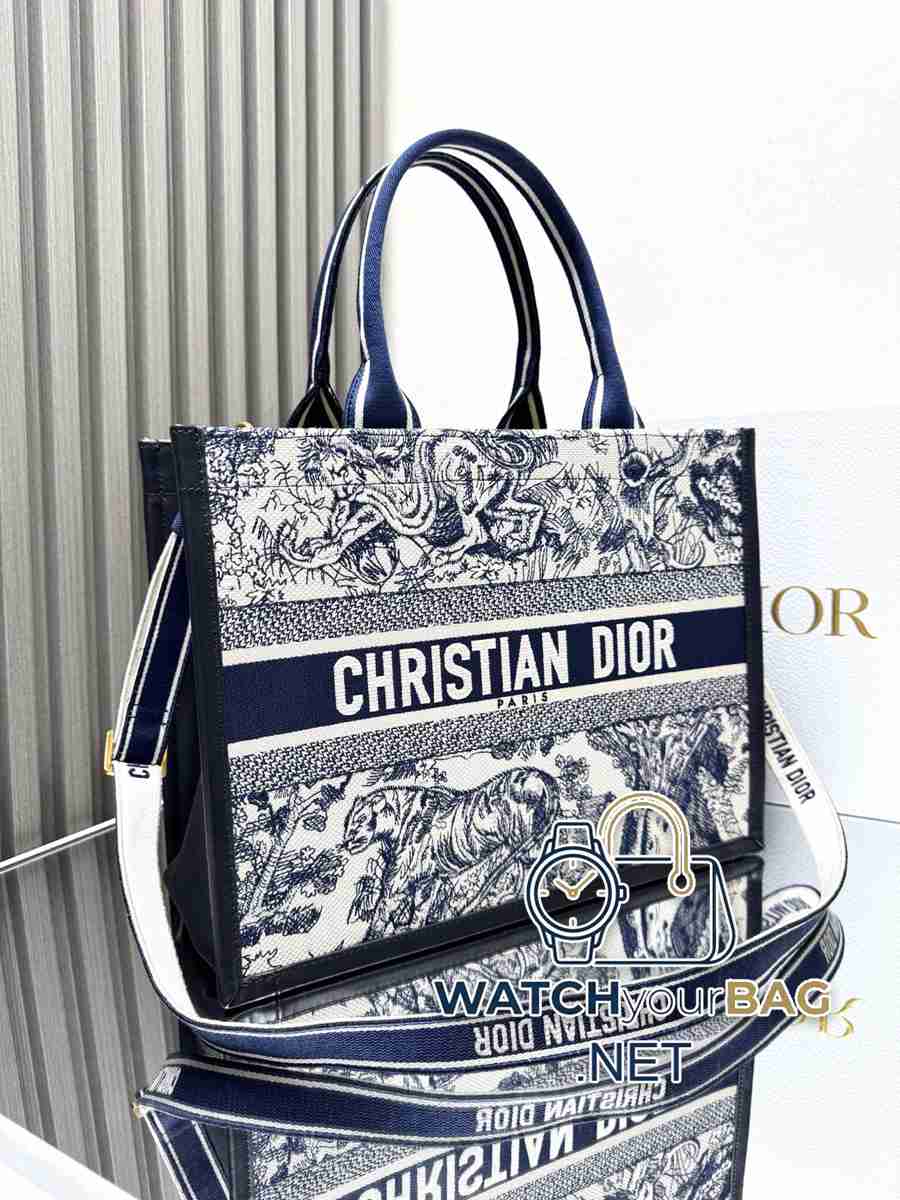 Old blue tiger embroidered leather with shoulder strap❤ Medium Dior book tote shopping bag This Book Tote handbag is inspired by women’s creative director Maria Grazia Chiuri (Maria Grazia Chiuri) and is a flagship product that embodies the Dior aesthetic. It can store a variety of daily necessities, and features a new interpretation of Bayadere pattern mixed effect D-Stripes pattern embroidery, which is more fashionable. The front is decorated with the “Christian Dior” logo, which fully reflects Dior’s exquisite craftsmanship. Dimensions: 36×28 cm