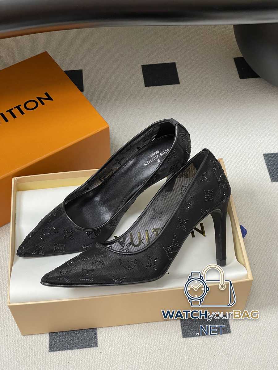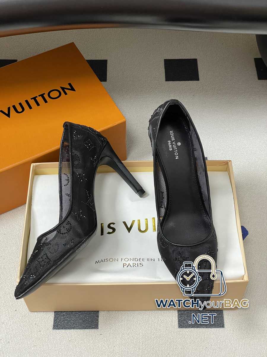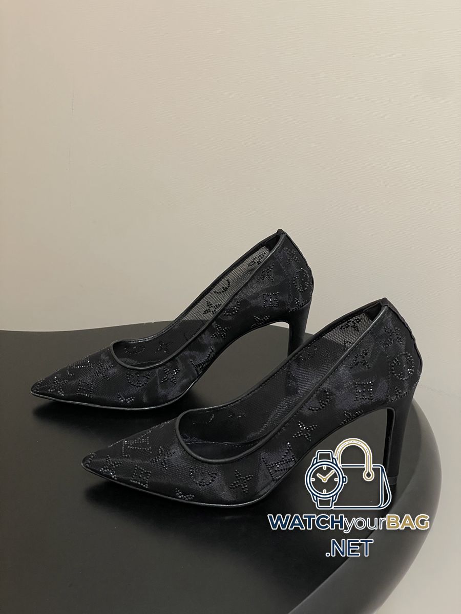 25ss new summer style LOUIS VUITTON GALA High Heels Mesh Diamond Top Fairy Shoes Mesh Hot Diamond Flat Shoes Bing…Bling…✨Mesh Crystal Diamond • This style of Gala high heels has a mesh body embroidered with a bright rhinestone Monogram pattern, making it an elegant choice for night outings. The smooth lines of the upper complement the slender high heel. The fine leather outsole is decorated with metallic LV lettering. The upper is made of breathable mesh material. This material not only allows the foot to remain relatively breathable and comfortable when wearing it, but also makes the rhinestone decoration on the upper more eye-catching. The inner sheepskin fits the skin of the foot and improves the wearing comfort experience! The pointed toe design can elongate the foot lines and make the feet look more slender and elegant. The flat bottom setting ensures comfort and walking convenience. It is suitable for long-term daily wear or matching with more formal or casual clothing styles. Upper: Customized mesh inlaid with hot Australian rhinestones. Inner foot pads: sheepskin. Sole: Italian grade A genuine leather. Heel height: 8.5cm. Size: 35-39 (40.41 custom-made, non-refundable).