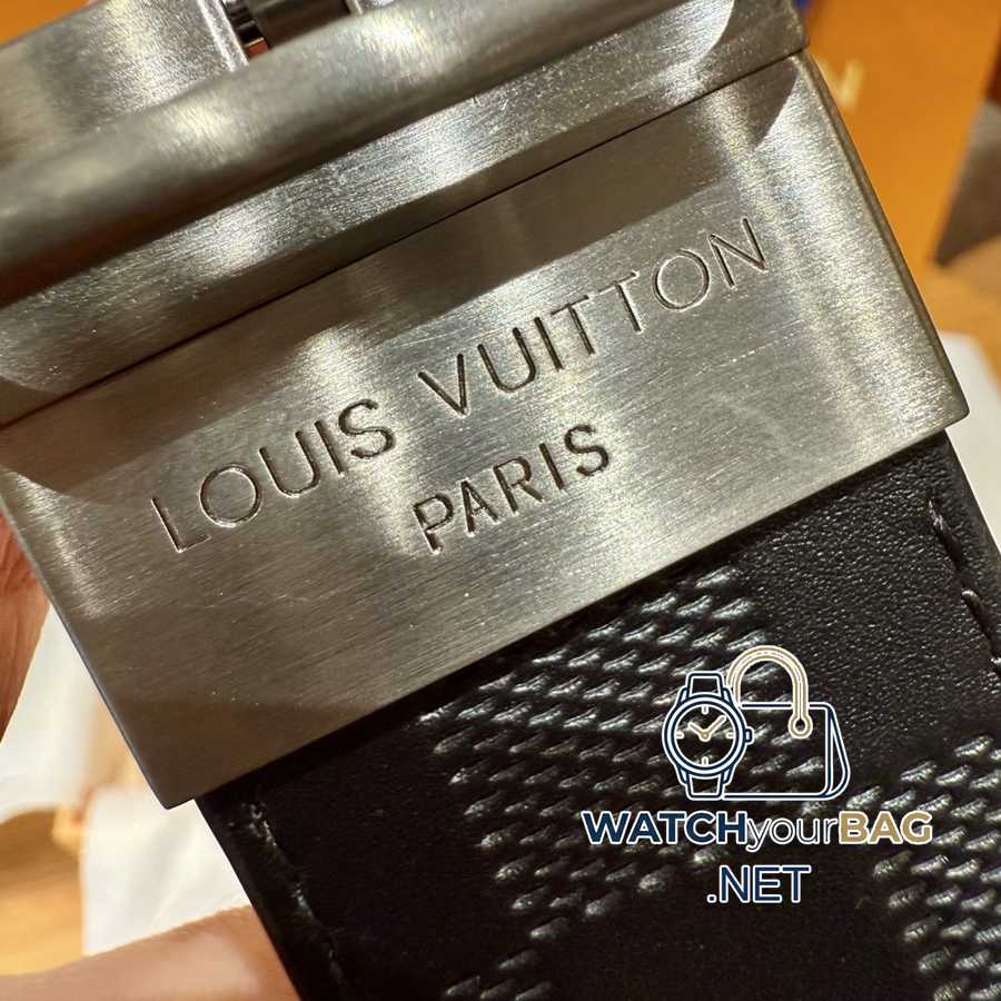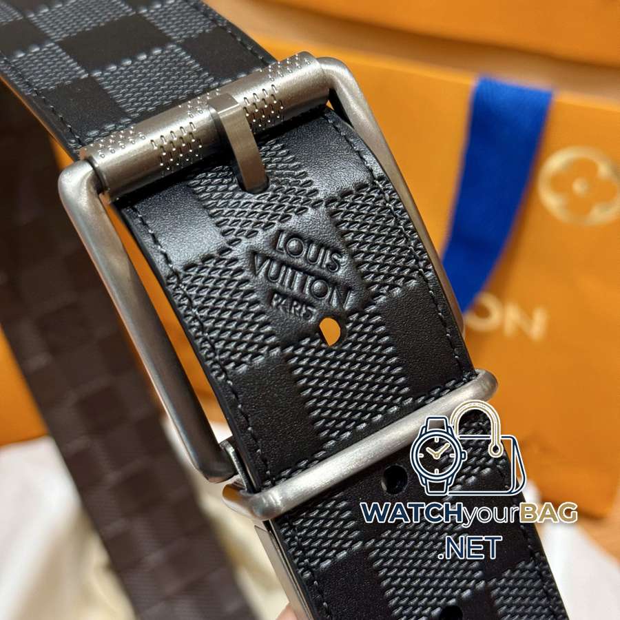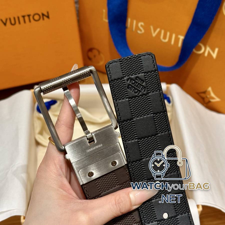 LV black checkerboard double-sided pin buckle belt. This pin buckle belt has calfskin checkerboard embossing and silver buckle hardware. It is calm and elegant. One side is black and the other is brown. It can be used on both sides. It is versatile for business and leisure. The width is 4.0cm.