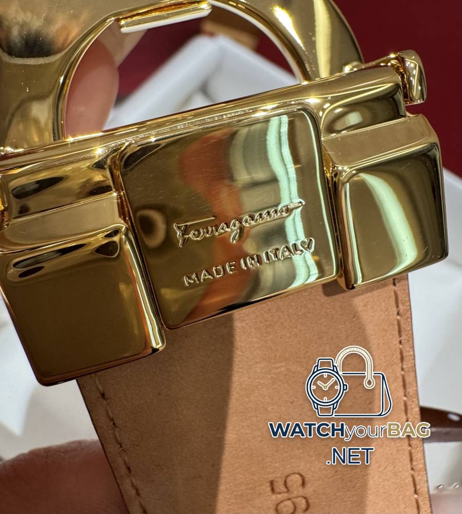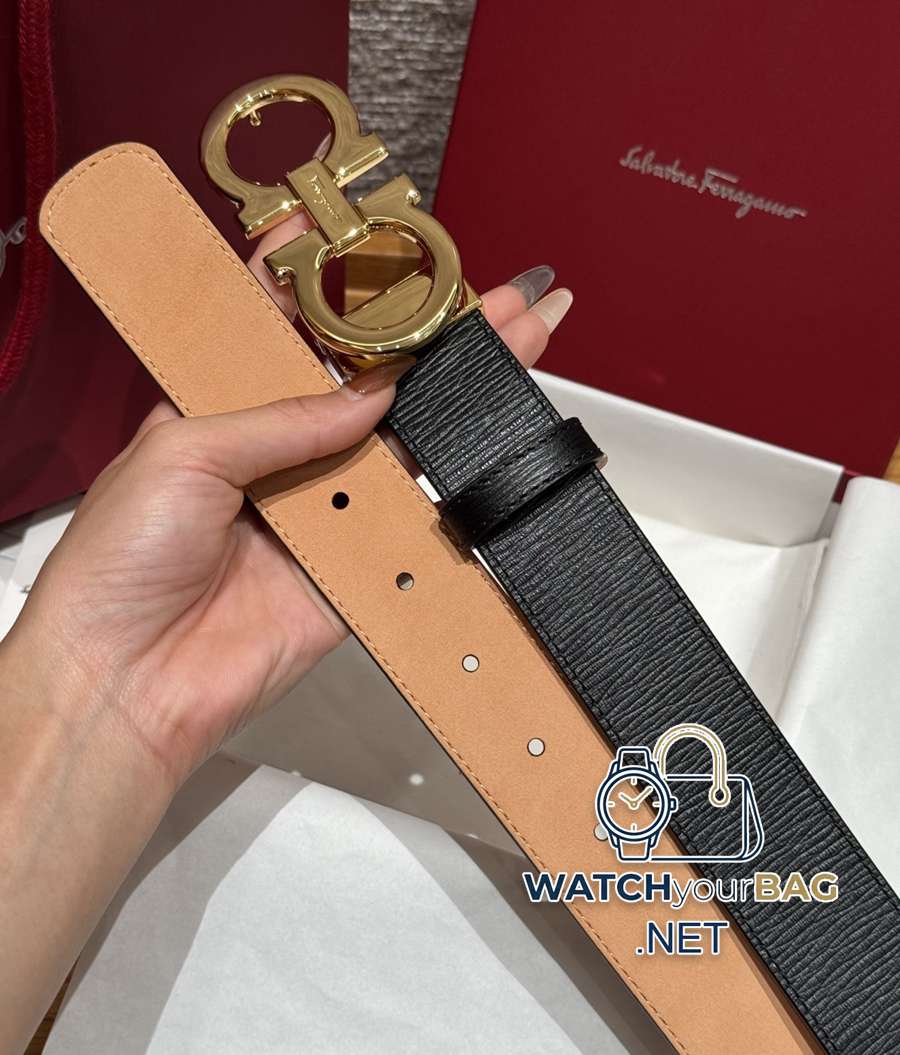 Double-sided adjustable Gancini belt This belt interprets the classic style with a modern style, and the contrasting stitching injects a casual appeal. The double-sided design is suitable for a variety of scenes. The contrast between the Gancini buckle and the palladium edge adds a refined style. The length is adjustable to achieve a tailor-made slimming effect. Width: 3.5cm