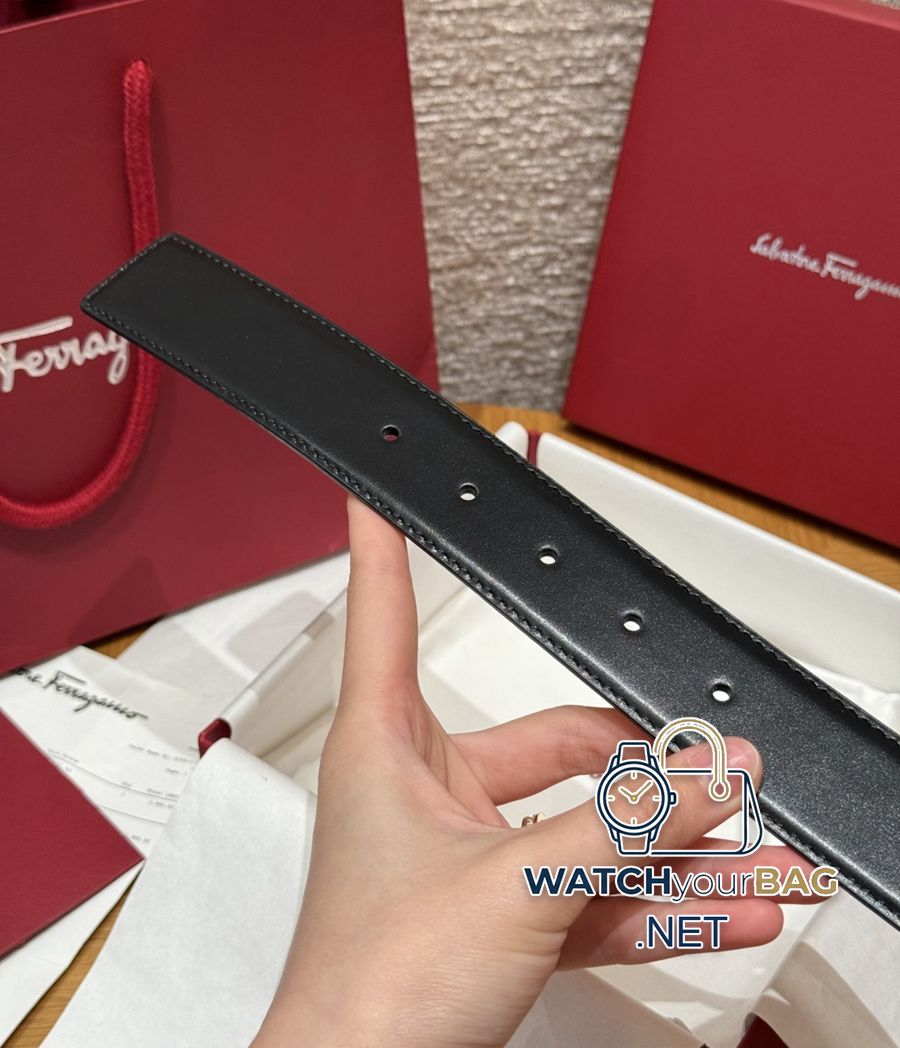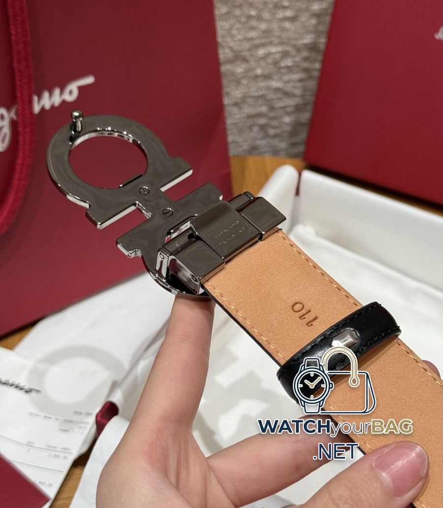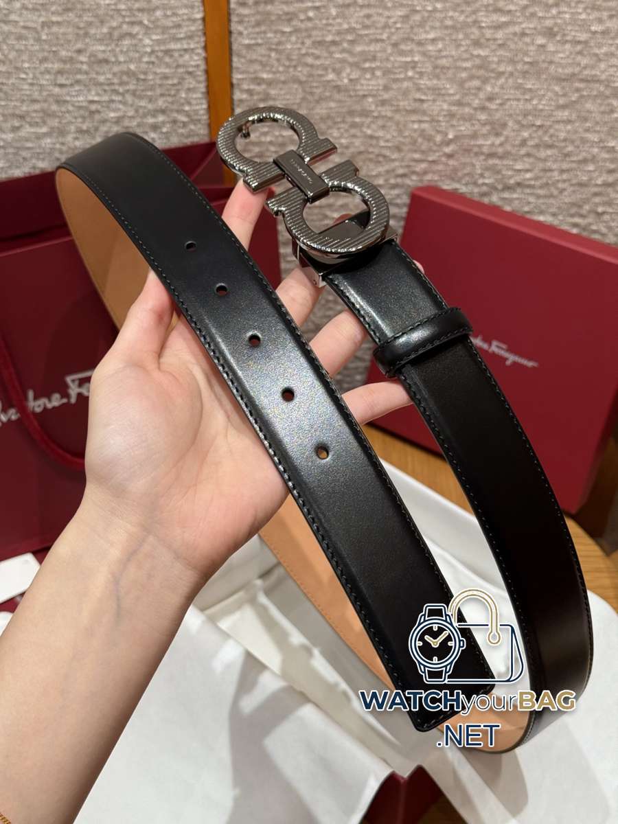 Double-sided adjustable Gancini belt This belt interprets the classic style with a modern style, and the contrasting stitching injects a casual appeal. The double-sided design is suitable for a variety of scenes. The contrast between the Gancini buckle and the palladium edge adds a refined style. The length is adjustable to achieve a tailor-made slimming effect. Width: 3.5cm