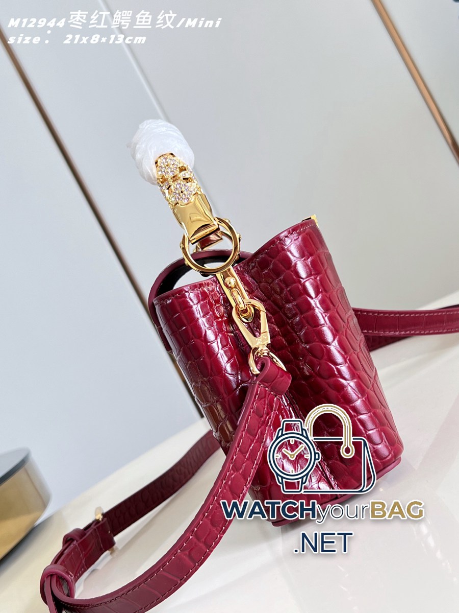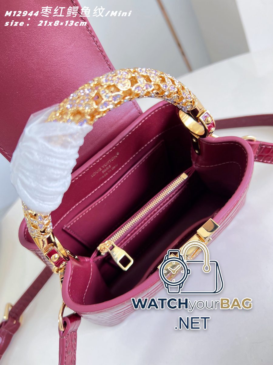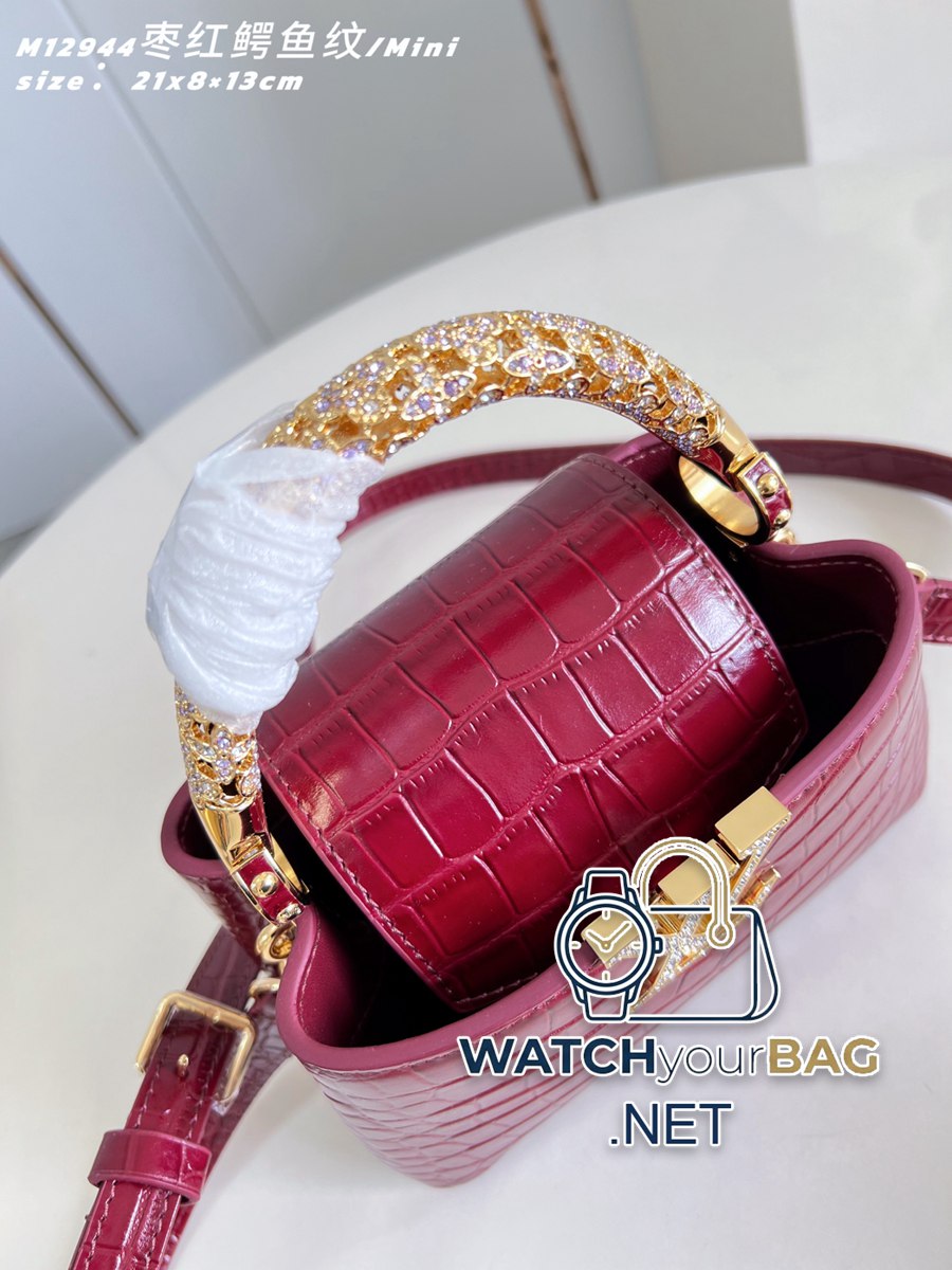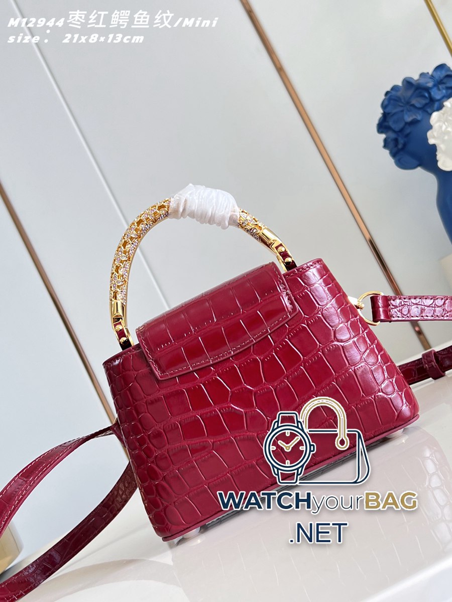 M12944 black crocodile pattern/mini This Capucines mini handbag comes from the Exceptionals series and is made of Taurillon cow leather. It is a perfect collection. Rhinestones infuse the LV letters with a jewelry texture, and the dazzling flower-shaped handles reference the classic Flower Crown necklace design. You can switch between multiple carrying modes at will, and the flip-top cover can be folded in or out. 21 x 13.6 x 8 (cm) (Length x Height x Width) J.
