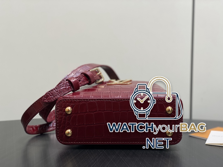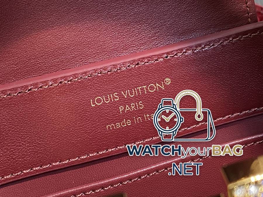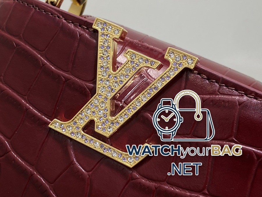 M12944 maroon crocodile pattern, diamond wrist, full leather cap Naying style CAPUCINES mini handbag This Capucines mini handbag comes from the Exceptionals series, and is made of Taurillon sj cow leather. It is a good choice for collection. Rhinestones infuse the LV letters with a jewelry texture, and the dazzling flower-shaped handles reference the classic Flower Crown necklace design. You can switch between multiple carrying modes at will, and the flip-top cover can be folded in or out. Dimensions: 13.6 x 8 x 21 cm (H x W x Length)