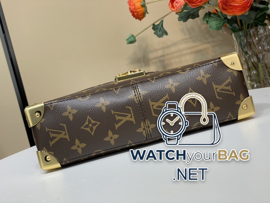 TRUNKIE Handbag m14526 Presbyopia/Chain Trunkie Handbag combines Monogram canvas and metal rivets, with metallic corners and iconic S-lock to highlight the brand heritage with a retro luggage style. The internal space and zipper pockets make it easy to accommodate daily needs, and the sliding chain shoulder strap expands carrying options. Dimensions: 16 x 8 x 27 cm