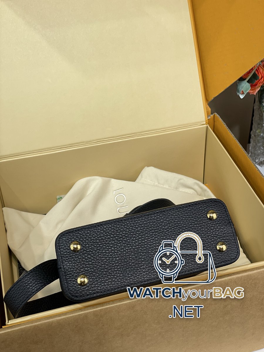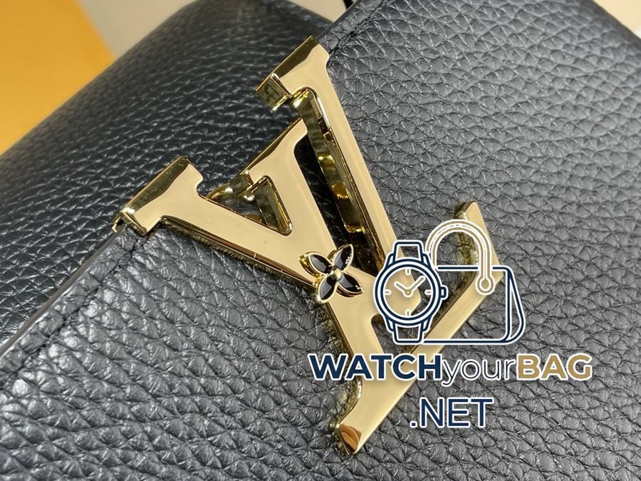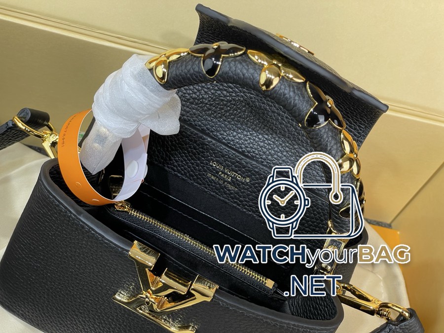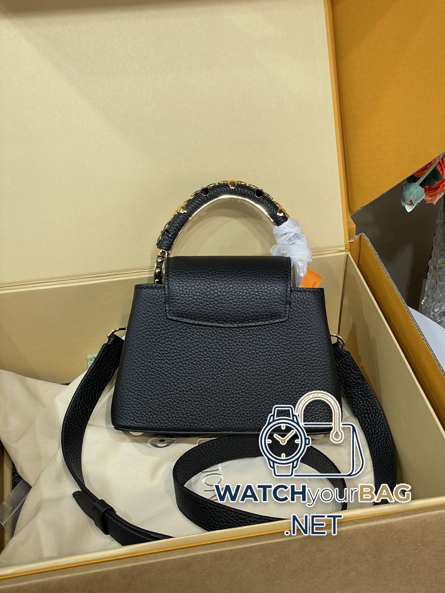 Capucines mini handbag M14976 black M48865 four-leaf clover full leather cap Na Ying model This Capucines mini handbag incorporates delicate Monogram flowers into the handle, and uses delicate brushstrokes to present the three-dimensional look of the LV logo, injecting dazzling light into the soft design. Full-grain Taurillon leather has a compact shape that can hold a smartphone, short wallet and other small essentials. Dimensions: 21 × 14 × 8 cm.