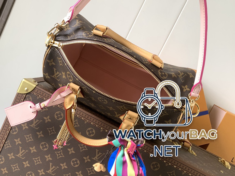 M26498 lucky bag M15102 black flower M15107 presbyopia M15108 sand dune This Louis Biton Bisenne Seoul exclusive capsule product can only be purchased through LV the Place Seoul, Shinsegae The Reserve offline stores and customer service teams. Speedy Soft Bandoulière 30 specially designed by Louis Bitton. Combining a sense of joy with traditional elements, the iconic style is reinterpreted. Symbolic single canvas material design, plus colorful leather straps. Featuring a variety of authentic ornaments including cilantro inspired by the Korean noni cap, a symbol of good luck and eternal youth. Dimensions: 30 x 21 x 17 cm (length x height x width)