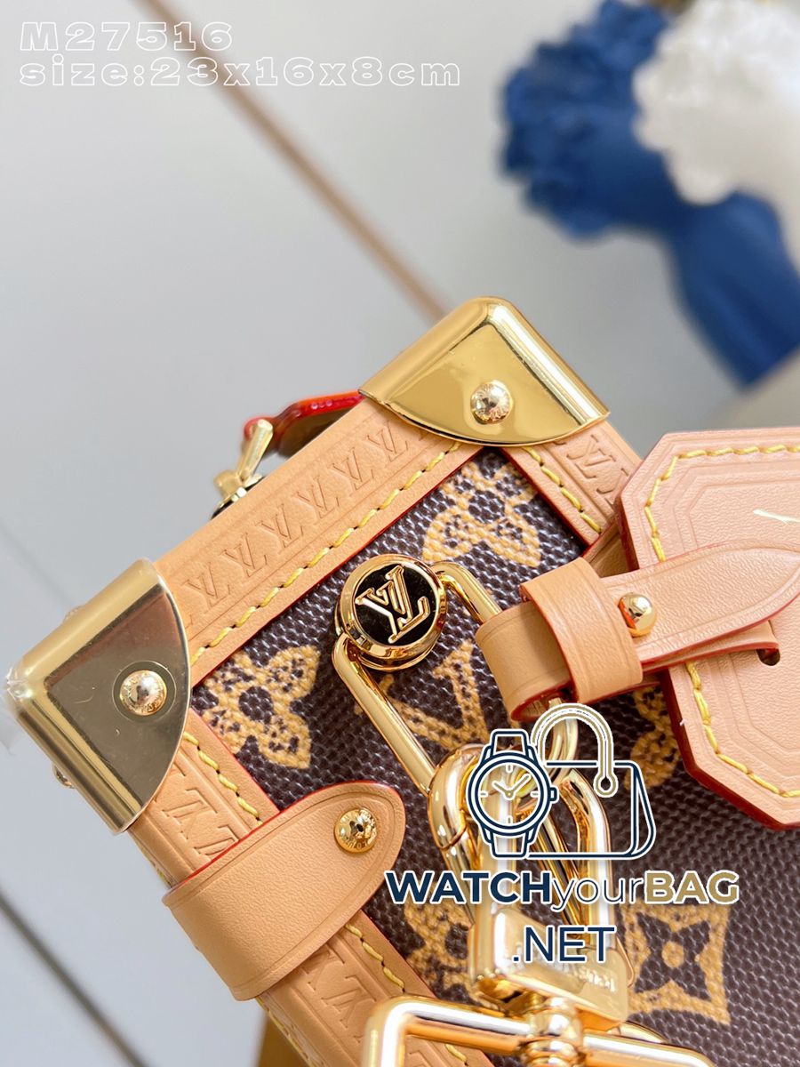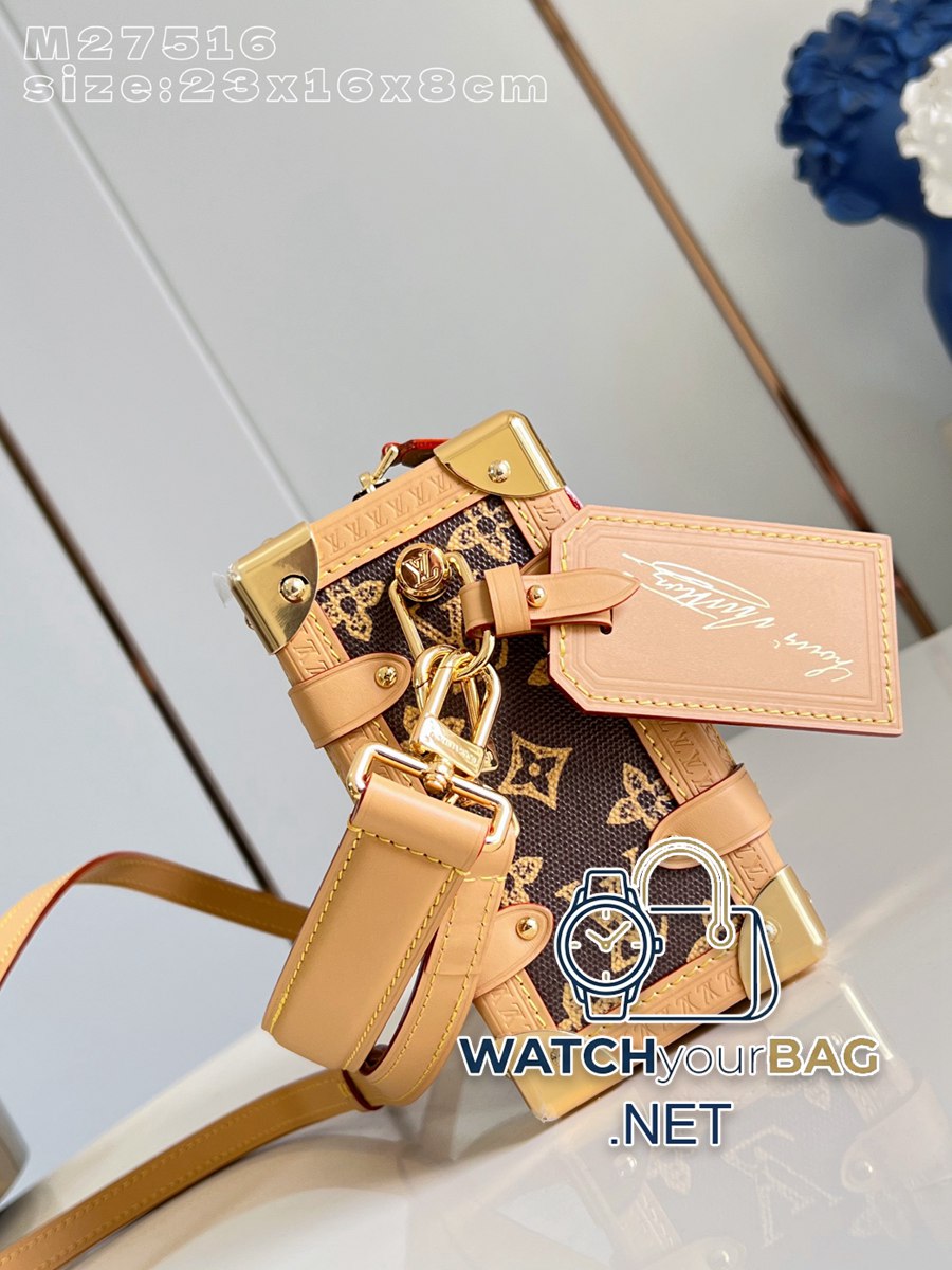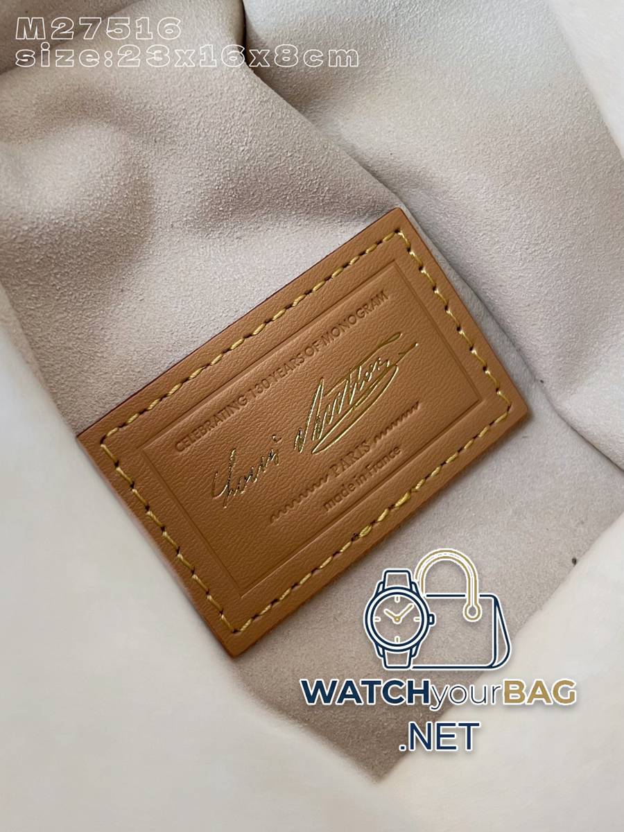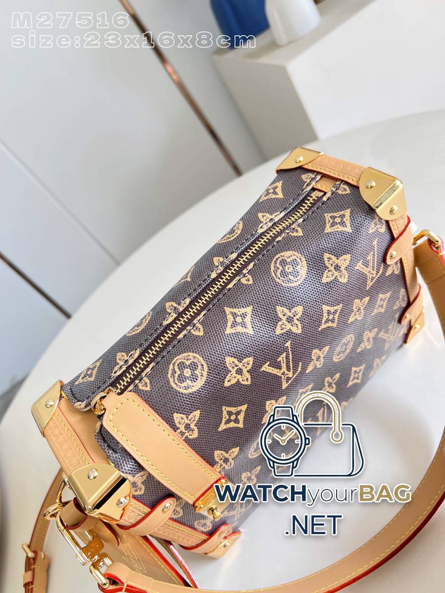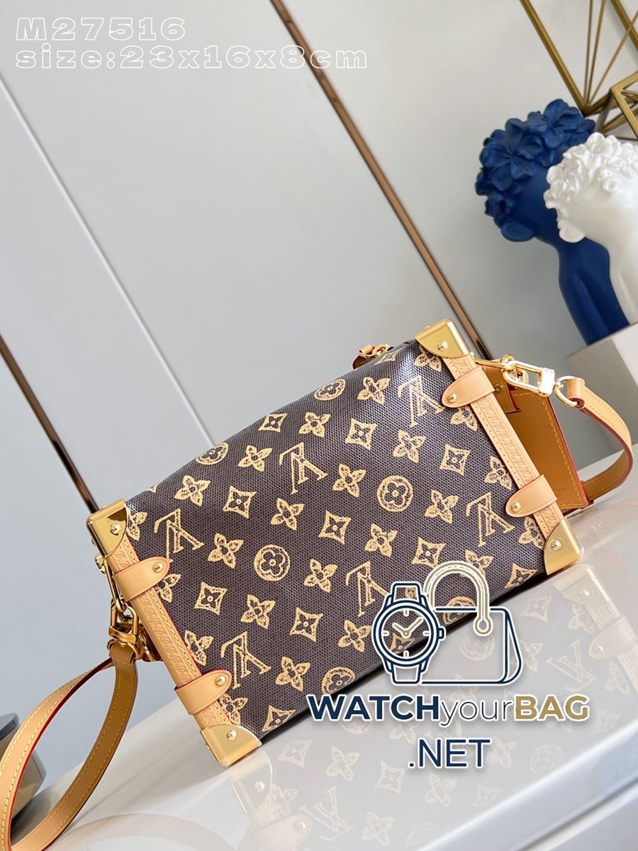 M27516 This medium Side Trunk bag commemorates the 130th anniversary of the Louis Vuitton Monogram. Monogram Origine canvas recreates a classic shape, with hardware like luggage-style corners and S-lock closures. Leather address plate and lining label exclusive to the Monogram Anniversary collection. 23.5 x 16 x 8.5 cm (length x height x width) Y.