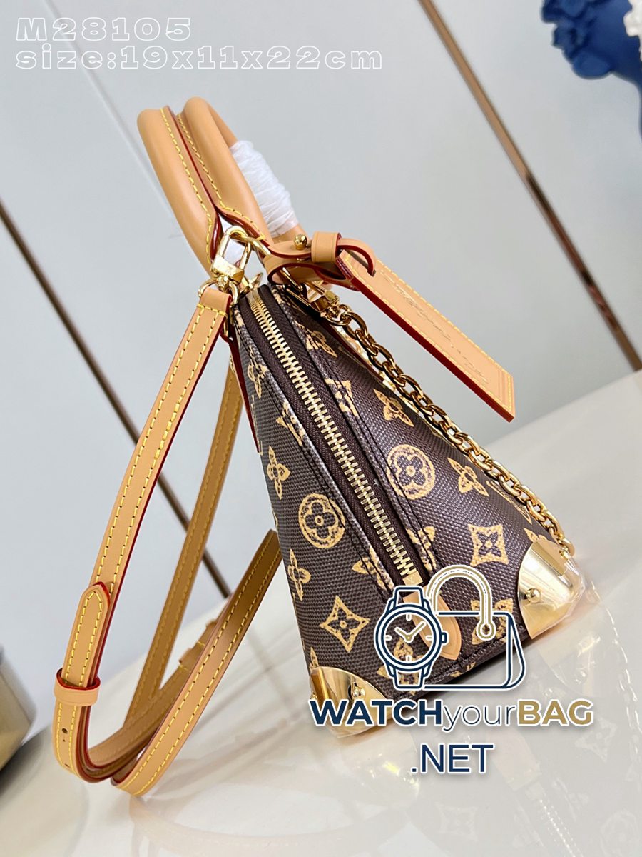 M28105 The Alma Trunk BB bag draws inspiration from Louis Vuitton’s 1908 archival design, updating traditional elements in the Monogram Origine pattern, which is complemented by chains, padlocks and metal corners. The compact construction makes it easy to carry by hand, shoulder or cross-body. 19 x 11 x 22 cm (height x width x length) Y.