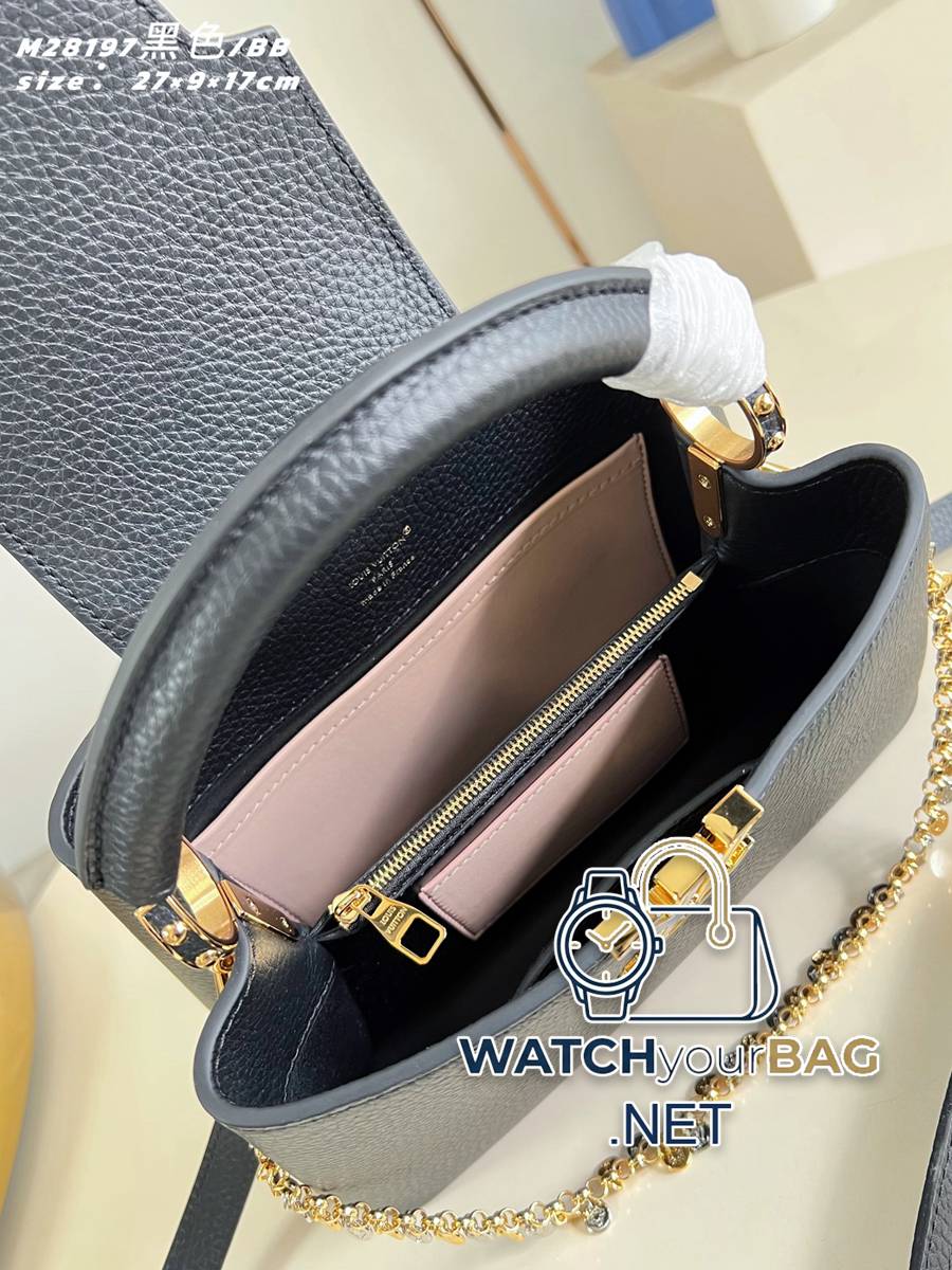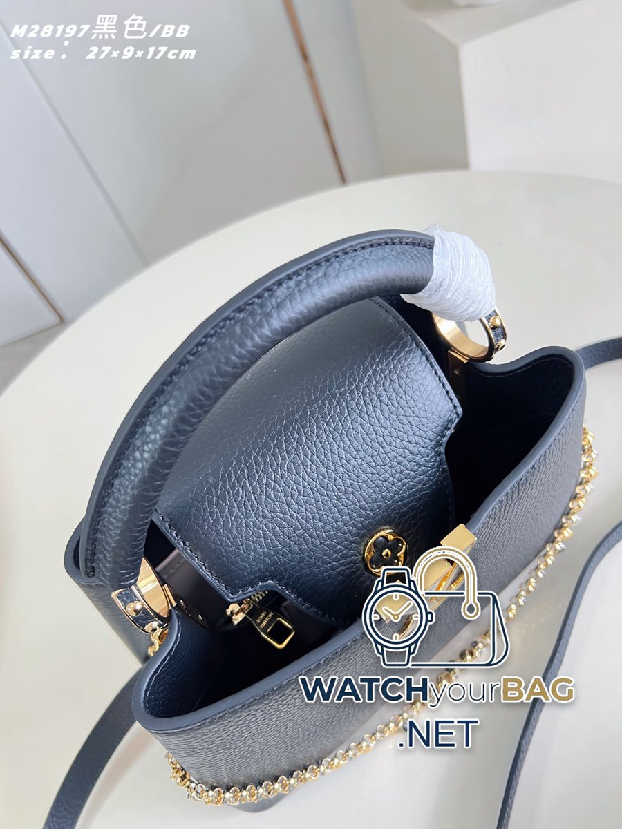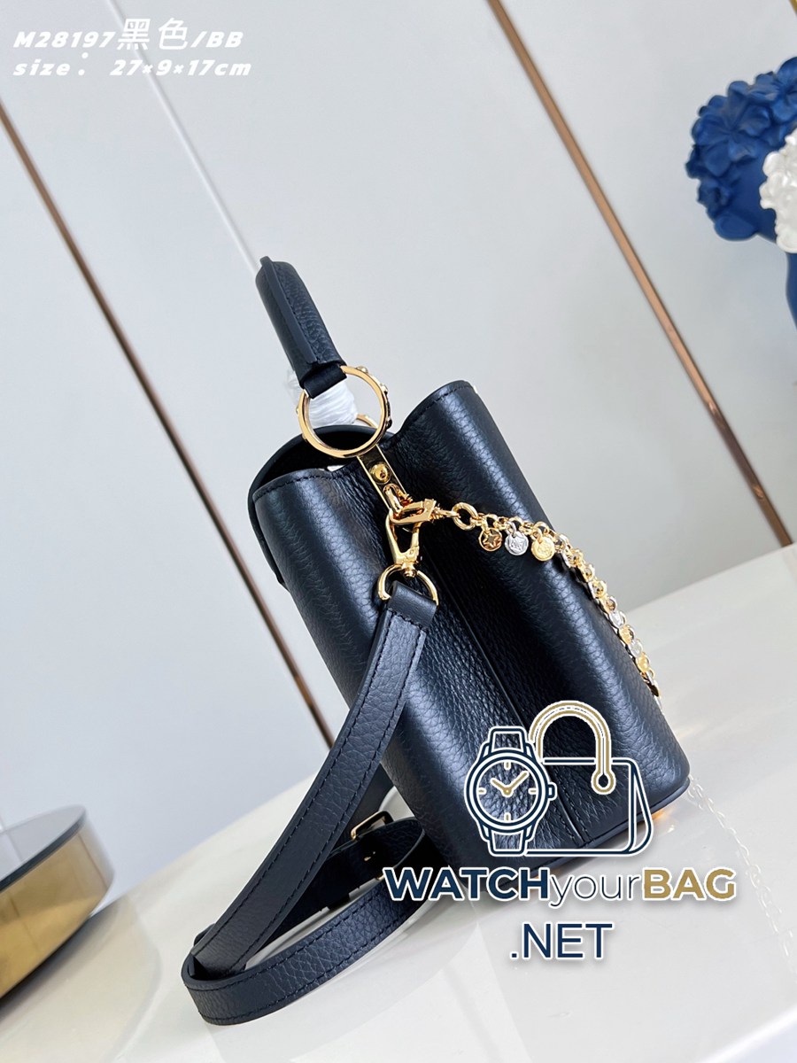 M28197 Black/Small LV Confetti series presents an upgraded version of the Capucines BB handbag. The Taurillon cow leather bag is embellished with exquisite chains and LV logos, showing the brand’s exquisite craftsmanship. The right size can accommodate mobile phones and other daily needs, making it an ideal choice for urban commuting. 19 x 9 x 27 cm (H x W x Length) J..