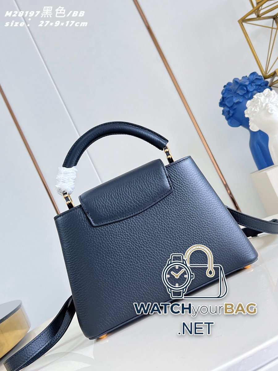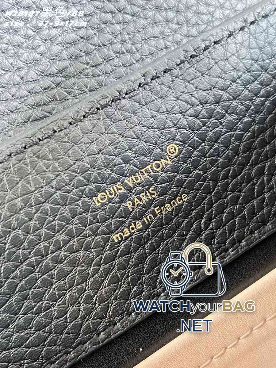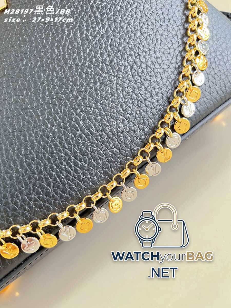 M28197 Black/Small LV Confetti series presents an upgraded version of the Capucines BB handbag. The Taurillon cow leather bag is embellished with exquisite chains and LV logos, showing the brand’s exquisite craftsmanship. The right size can accommodate mobile phones and other daily needs, making it an ideal choice for urban commuting. 19 x 9 x 27 cm (H x W x Length) J..