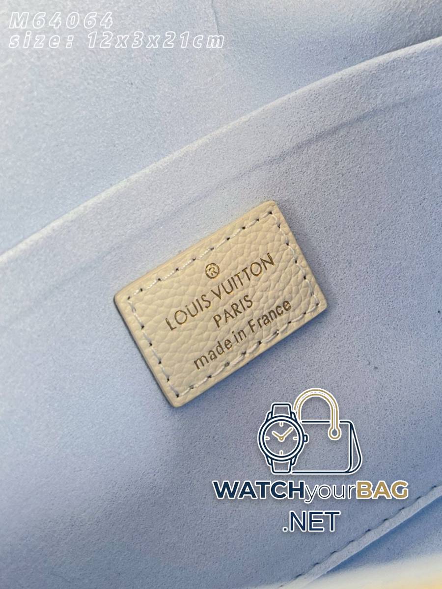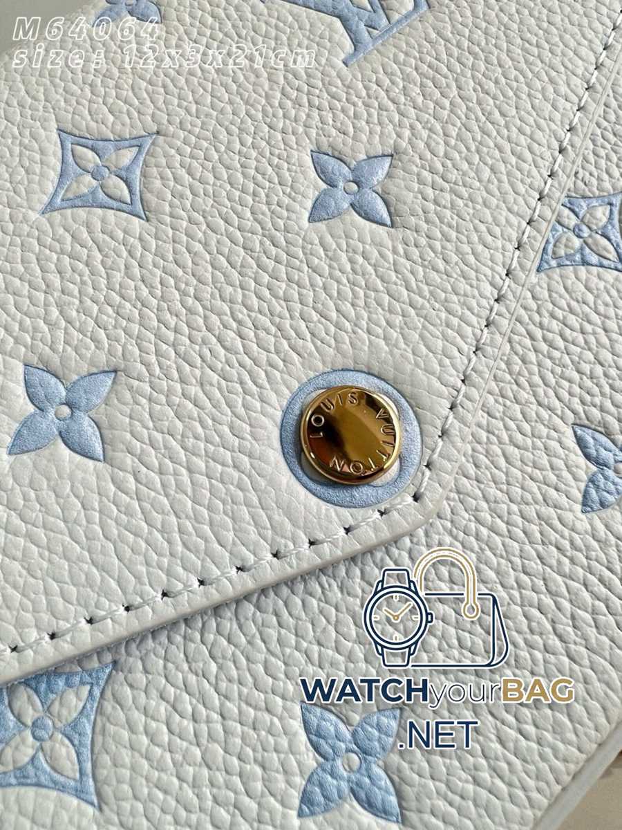 M64064 cream printed blue M28127 This chette Félicie handbag is from the Sweet Esca series and is crafted from classic Monogram Emeinte leather. It has two detachable pockets with unique features: one with a zipper design and the other with a card compartment. The elegant chain flexibly switches between multiple wearing styles. 12 x 3 x 21 cm (H x W x Length)Q