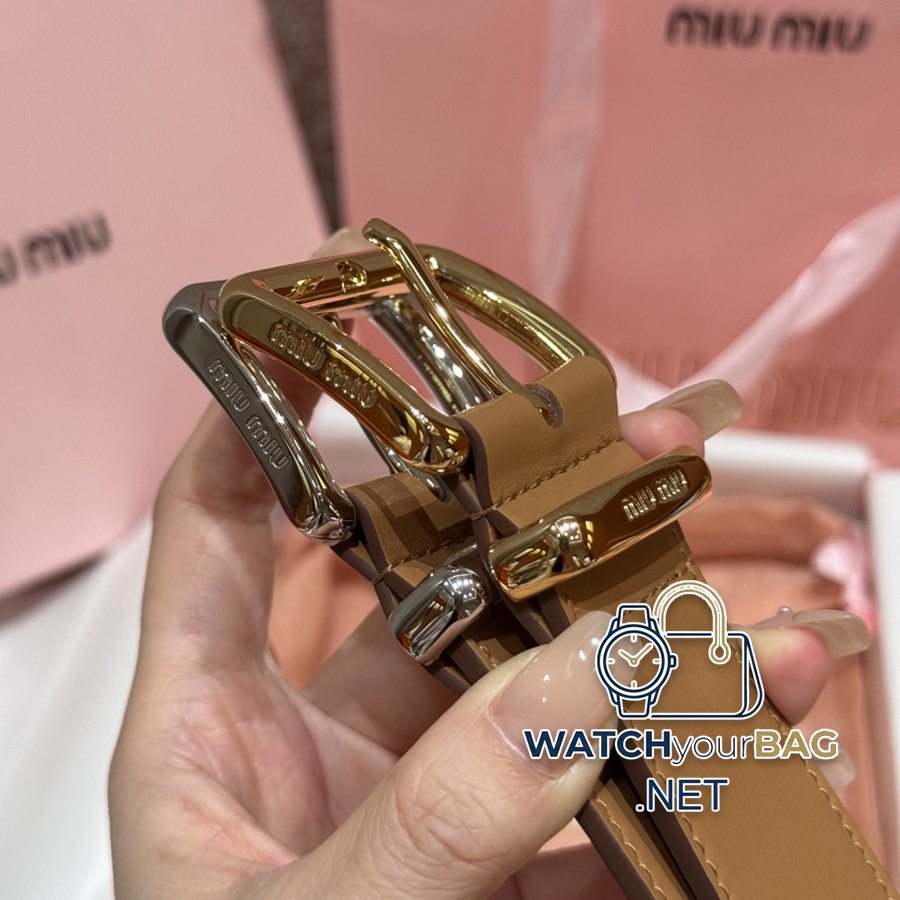 Collection picture MiuMiu new women glossy belt. This leather belt is ideal for enhancing your chic look. It has an eye-catching engraved hardware logo and a square pin buckle. It is made of smooth leather and has a soft and delicate calfskin feel. It is very versatile with skirts and jeans. Width 3.5cm.