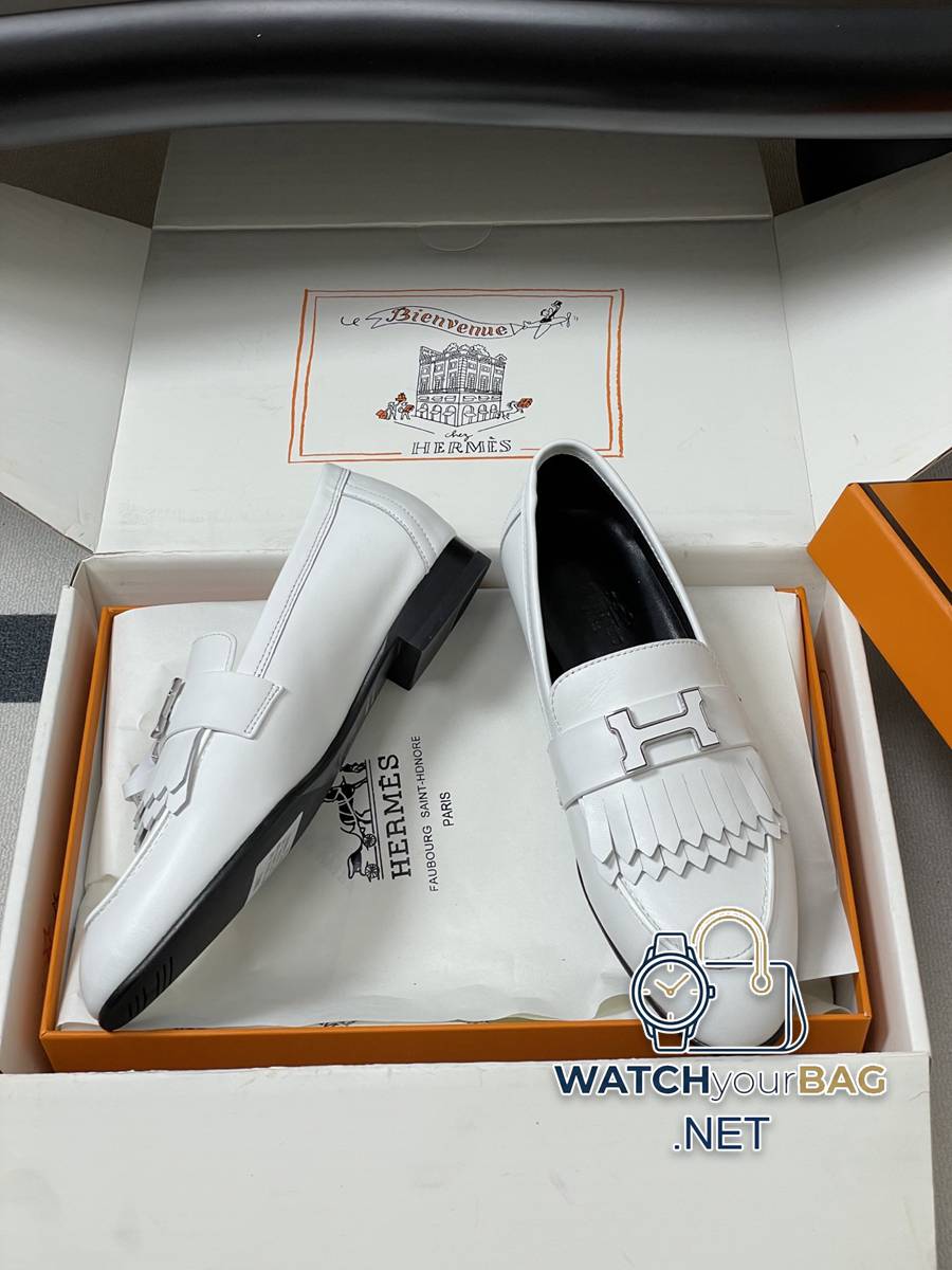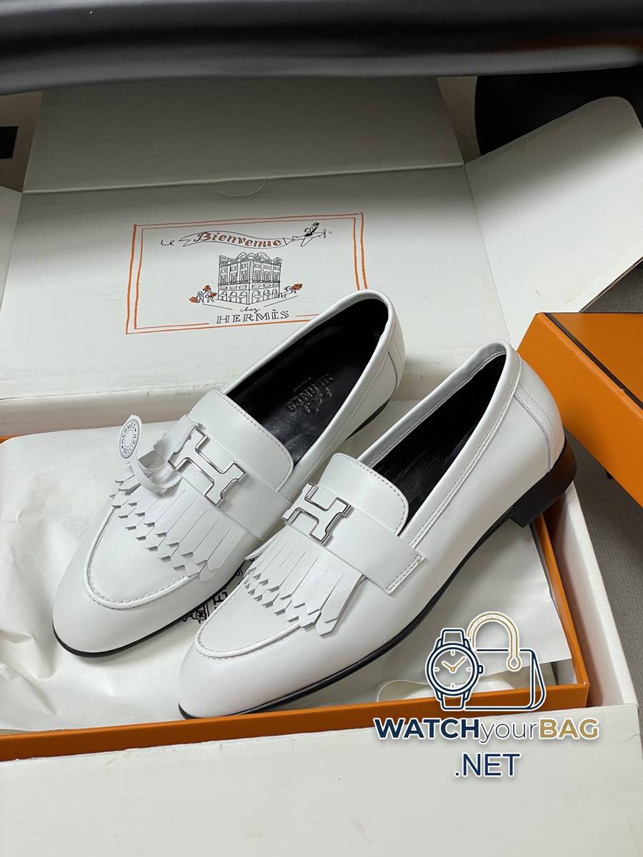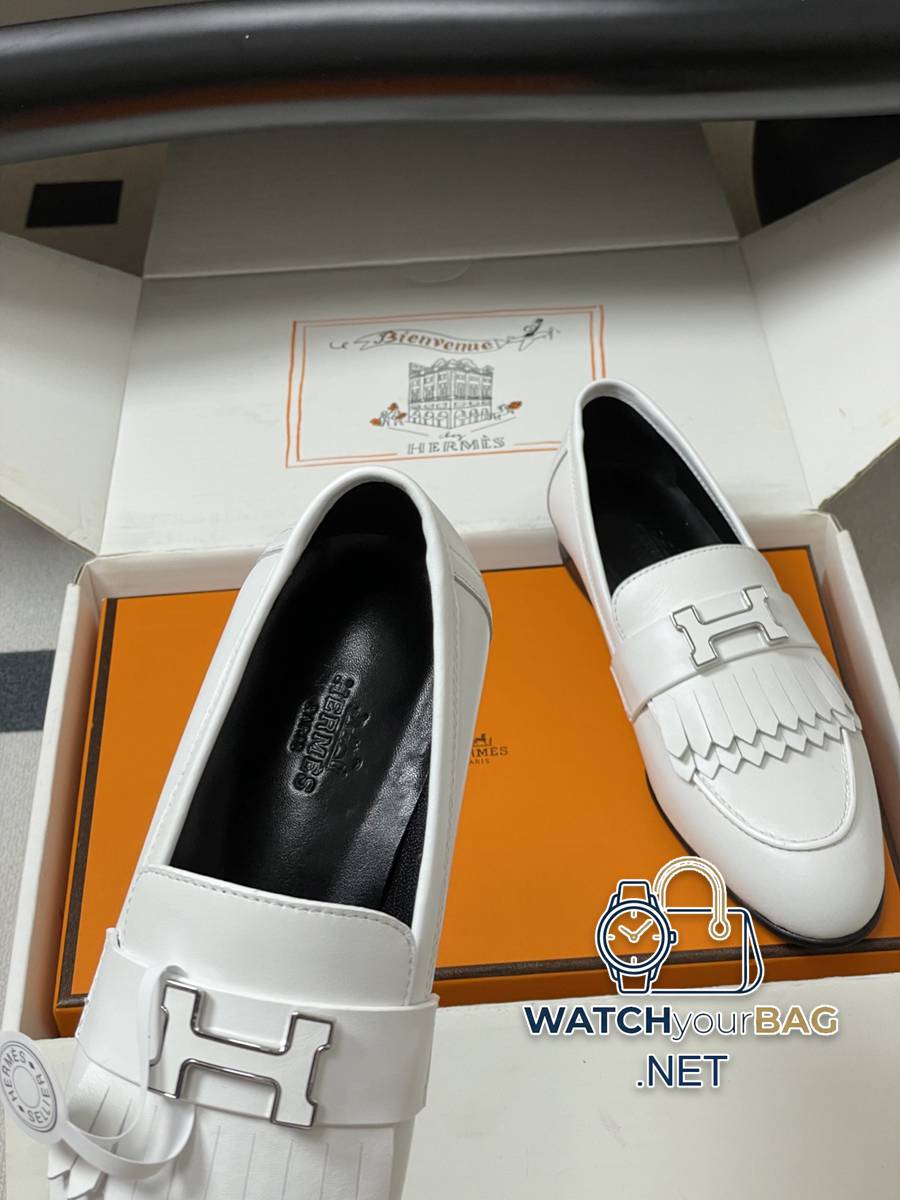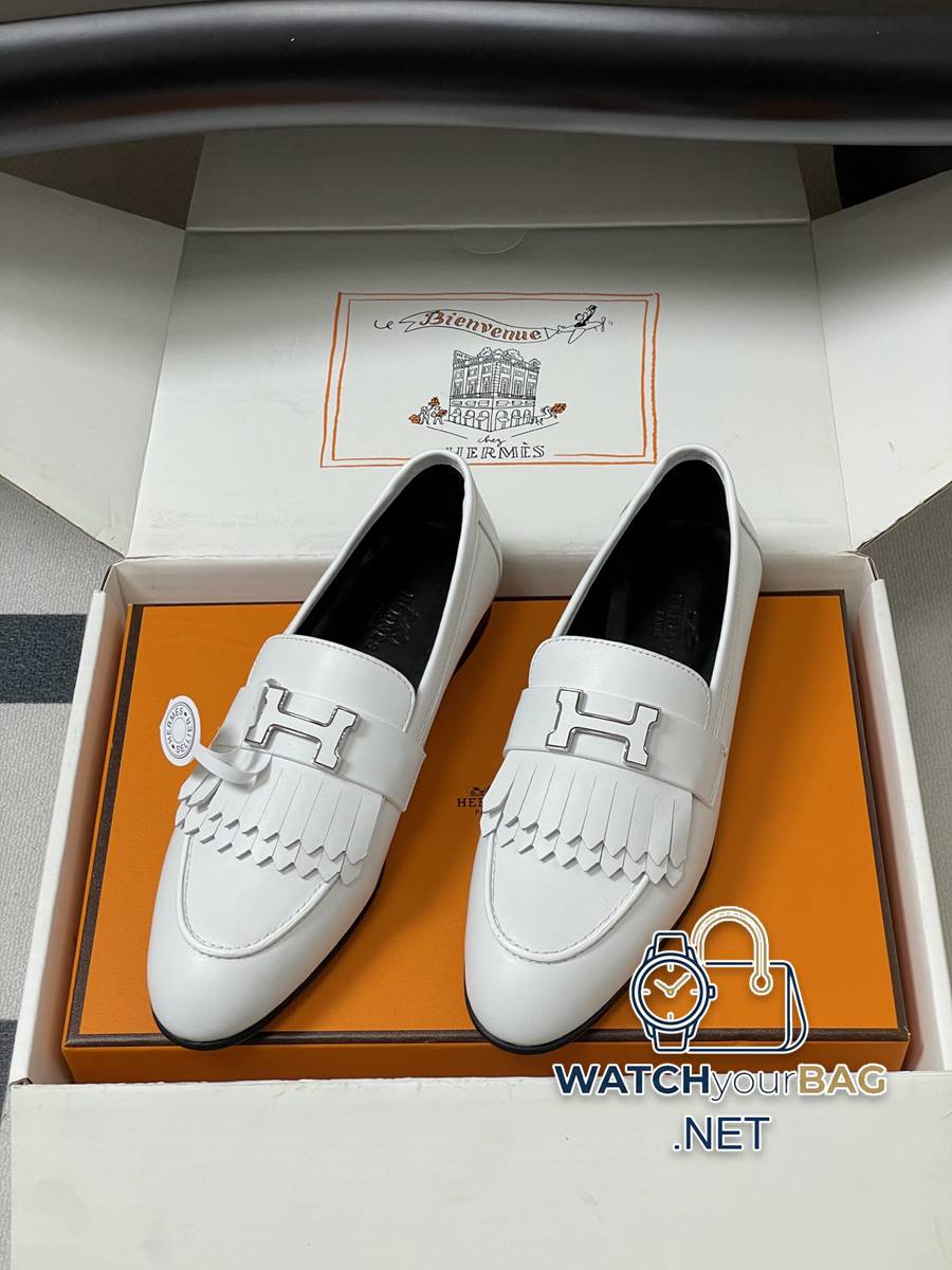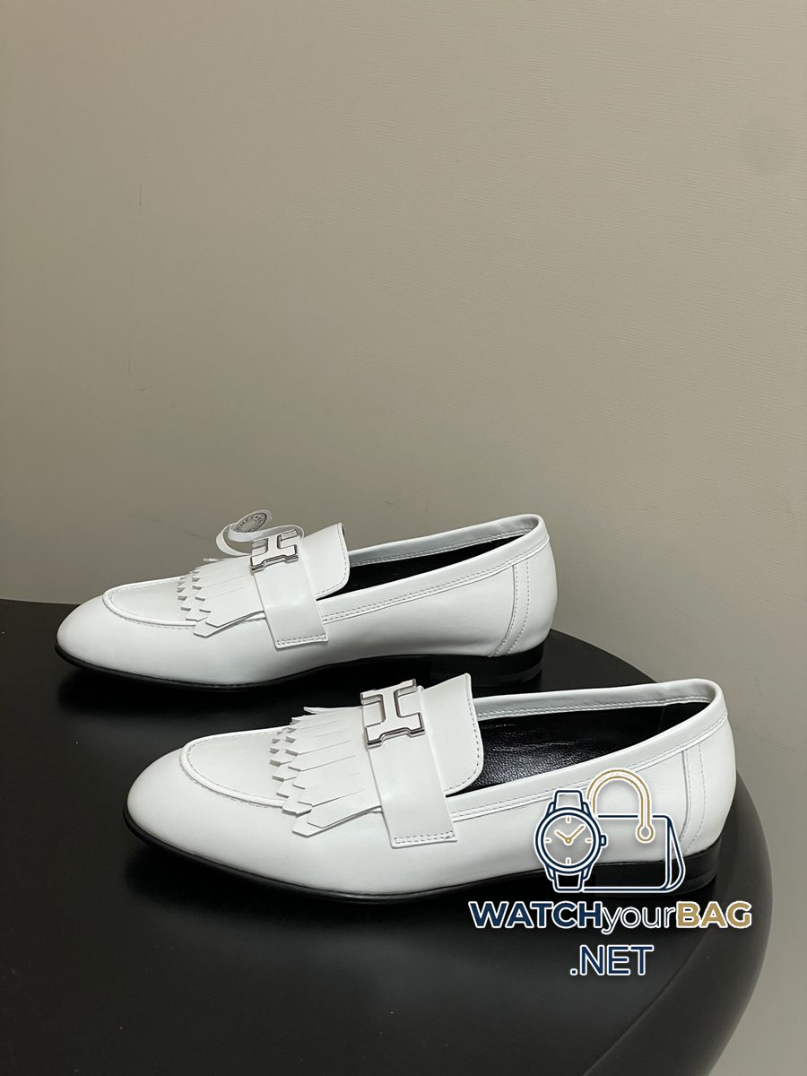 Hermes Paris/Poyal loafers classic series H letter metal buckle loafers slip-on shoes flat tassel loafers calfskin loafers decorated with iconic “H” details. Create a trendy look. Upper: Customized calfskin lining Foot pads: Sheepskin Sole: Italian grade A leather outsole (injection molded forefoot) Code number: 35-39 (40.41.42 custom-made, non-refundable)