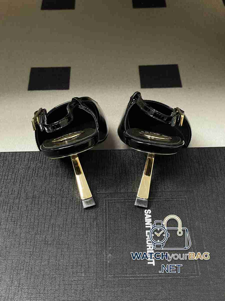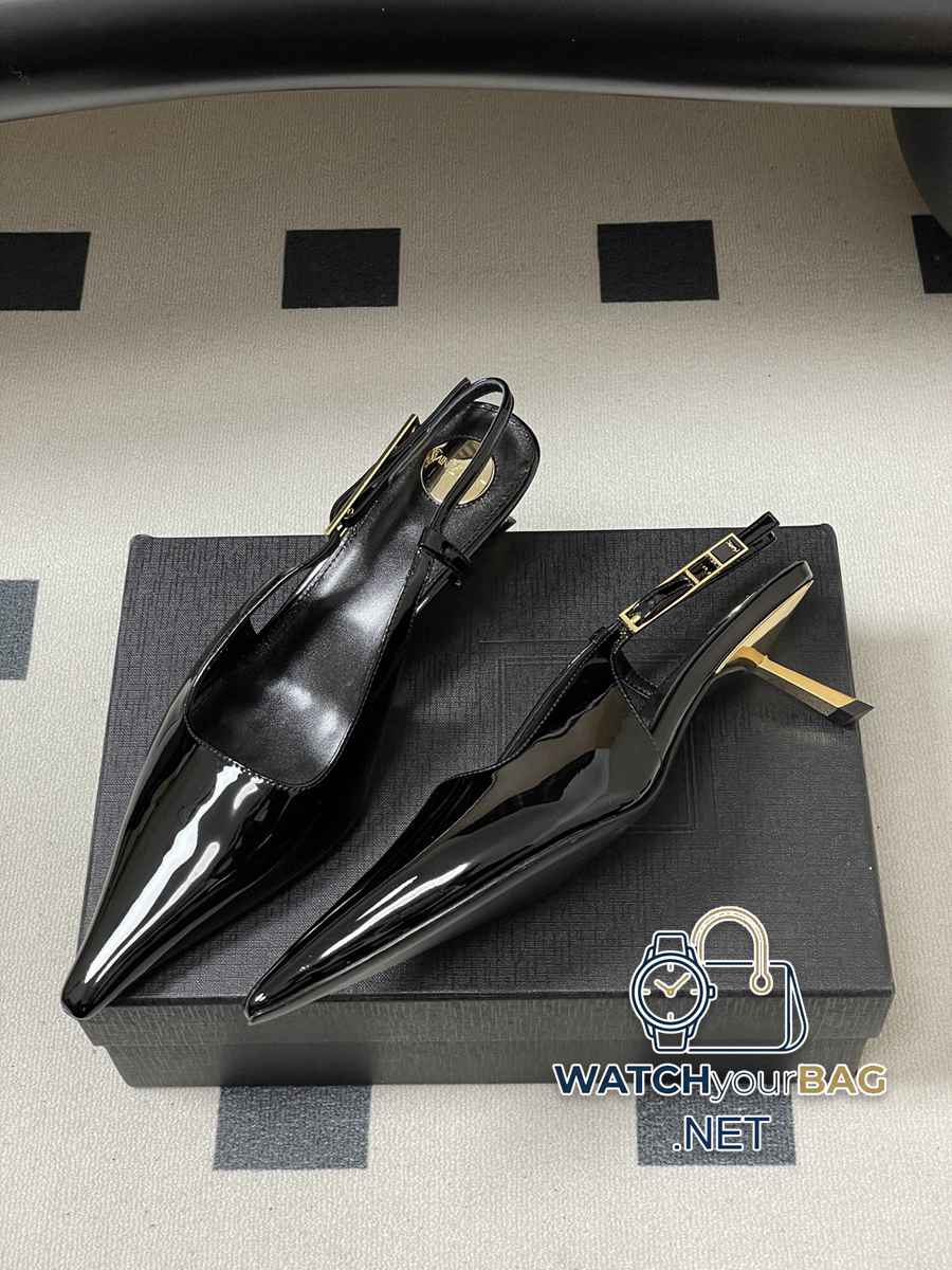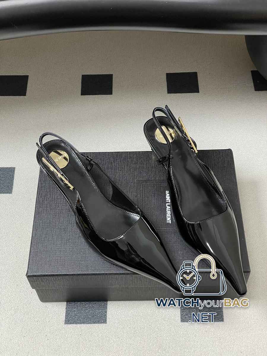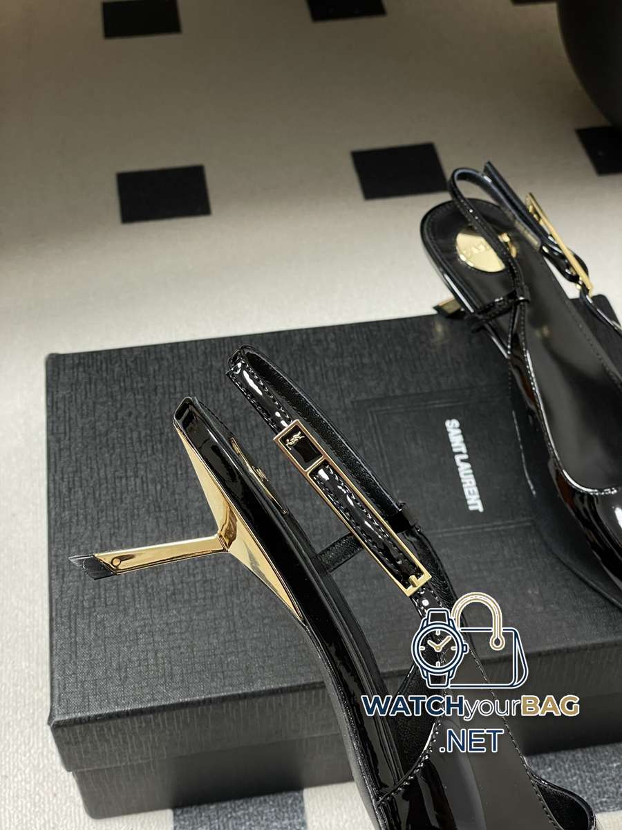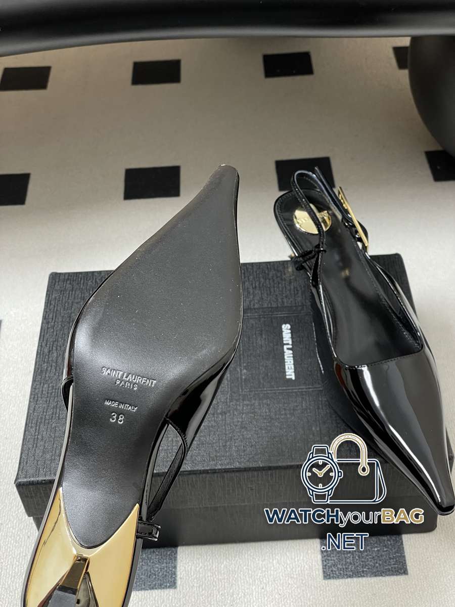 Saint Laurent fw25 new arrival~ YSL Saint Laurent 2026 spring and summer new pointed toe kitten heel sandals with empty back, glossy high heels, special-shaped gold heel sandals, the whole shoe is very simple and elegant~ the small pointed toe is more refined and fashionable. You can see that the side of our shoes is designed according to the curvature of the human leg shape~ the upper foot is very delicate and good-looking~ elongates the leg shape~ suitable for various occasions~ a must-have item for autumn and winter wear! Upper: Cow patent leather Lining Foot: Sheepskin Sole: Italian genuine leather Outsole Heel height: 5.5cm Size: 35-39 (40.41 customized, non-refundable