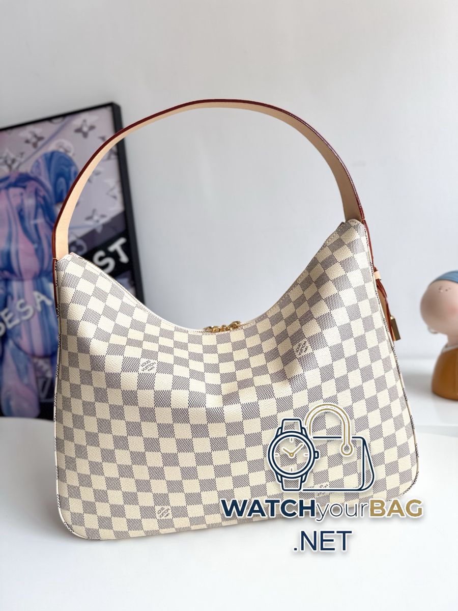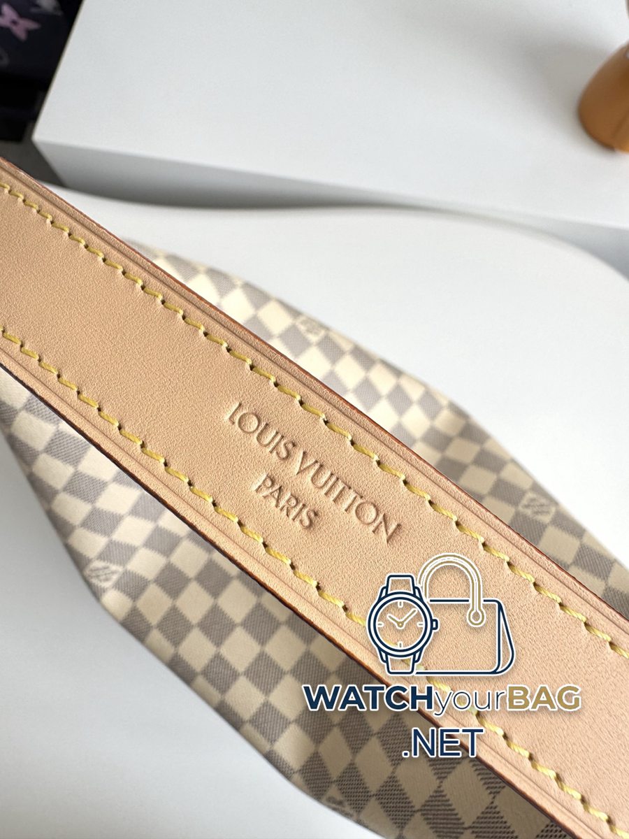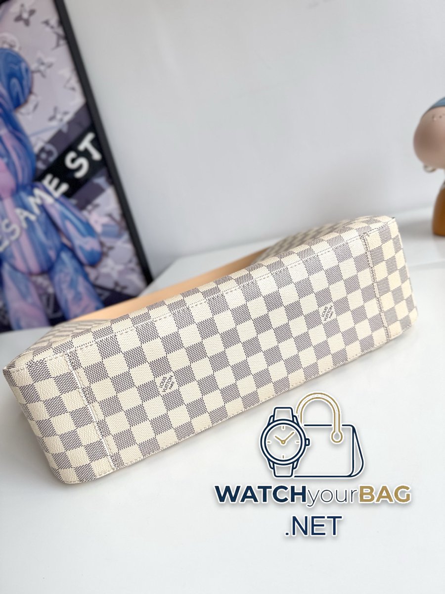 N00126 exclusive real shot! This elevated version of the Slouchy MM showcases the brand’s Damier Azur pattern as a signature throughout the graphic. Functional and sophisticated at the same time, it’s made from coated canvas using heliogravure printing technology to create a unique pattern. It comes with a signature padlock name tag and plenty of space inside to store essential items from work to the weekend. Size: 40×31×11cm