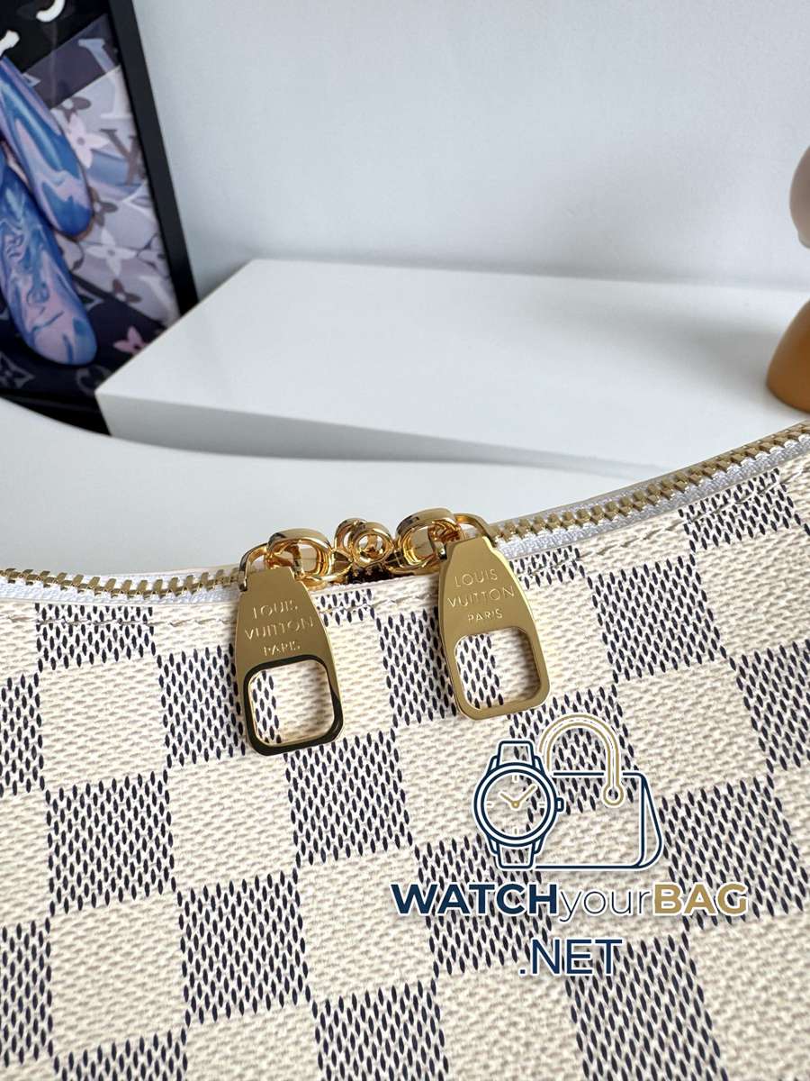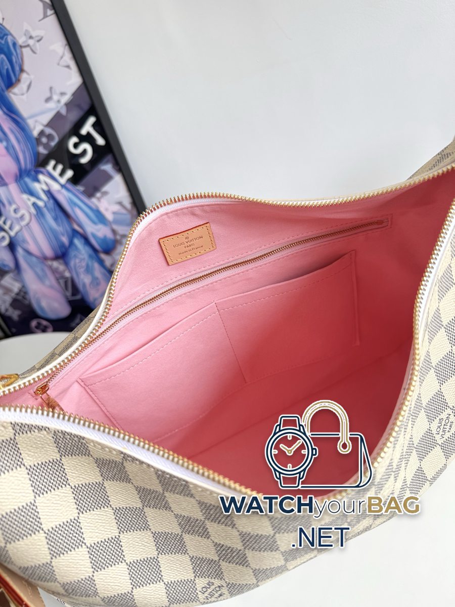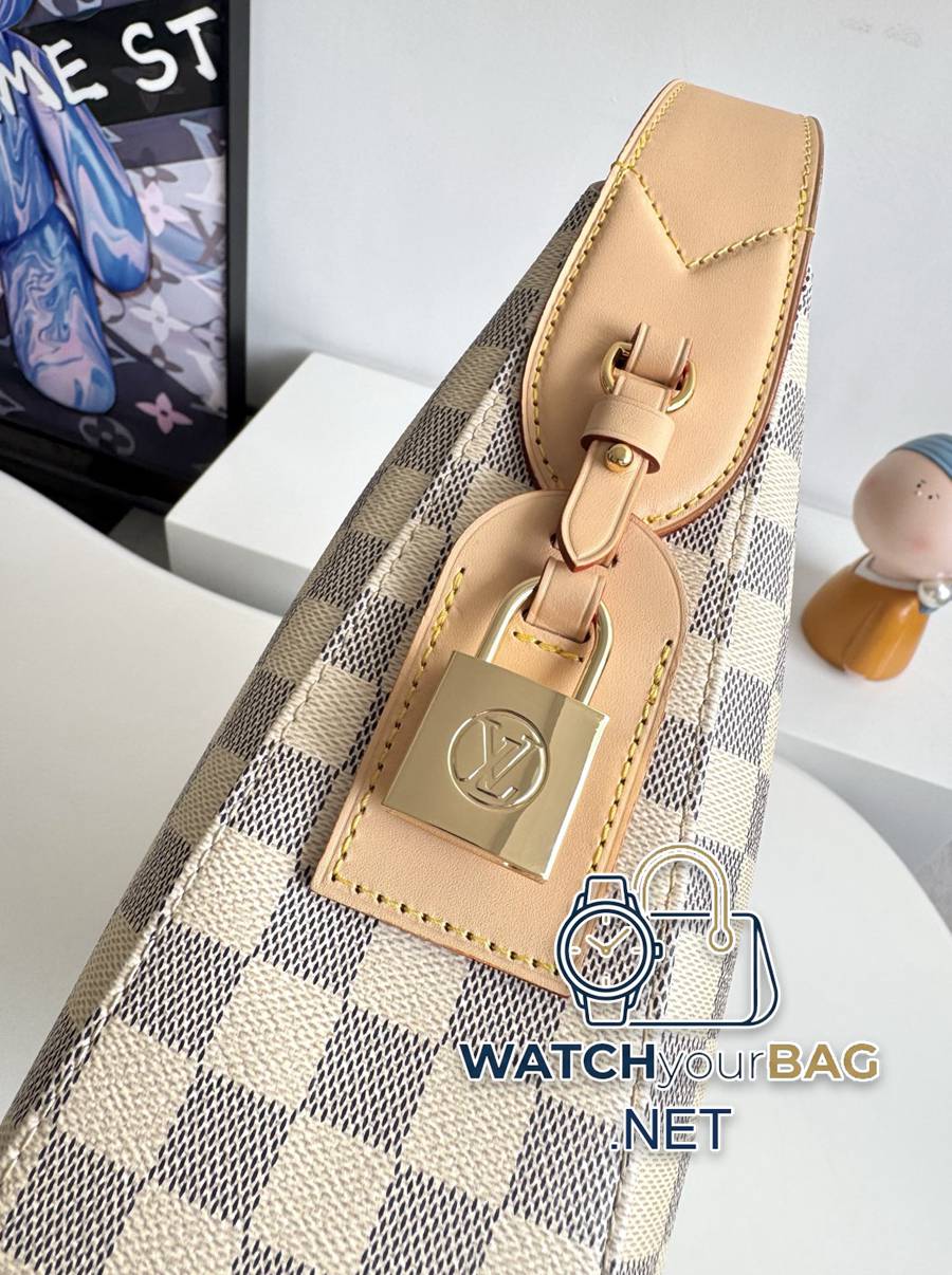 N00126 exclusive real shot! This elevated version of the Slouchy MM showcases the brand’s Damier Azur pattern as a signature throughout the graphic. Functional and sophisticated at the same time, it’s made from coated canvas using heliogravure printing technology to create a unique pattern. It comes with a signature padlock name tag and plenty of space inside to store essential items from work to the weekend. Size: 40×31×11cm
