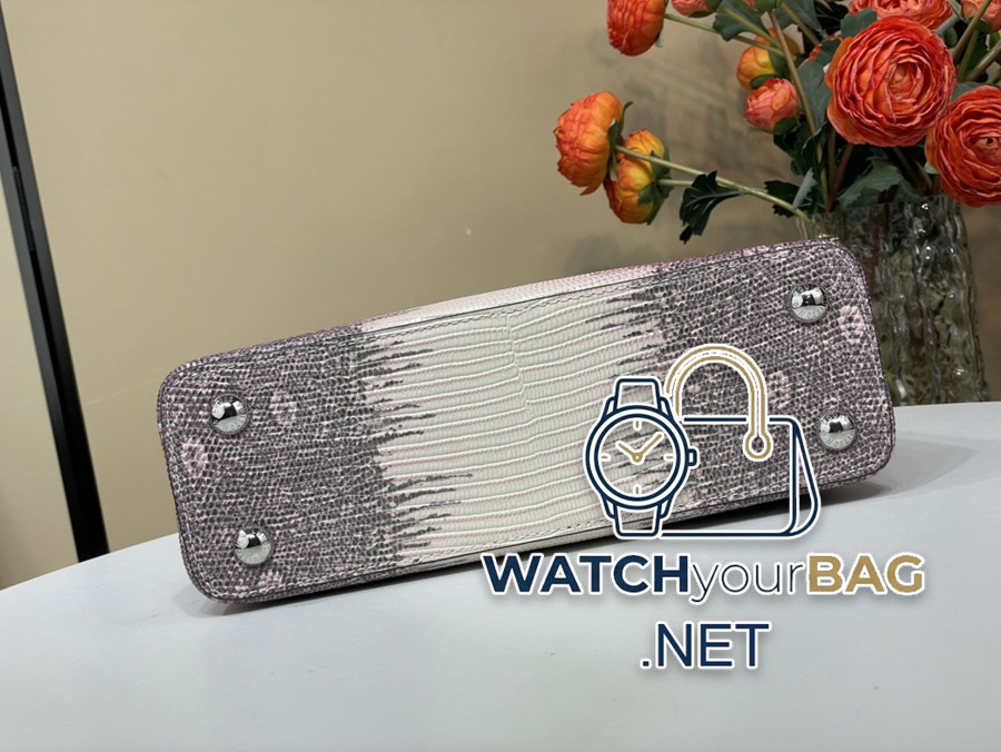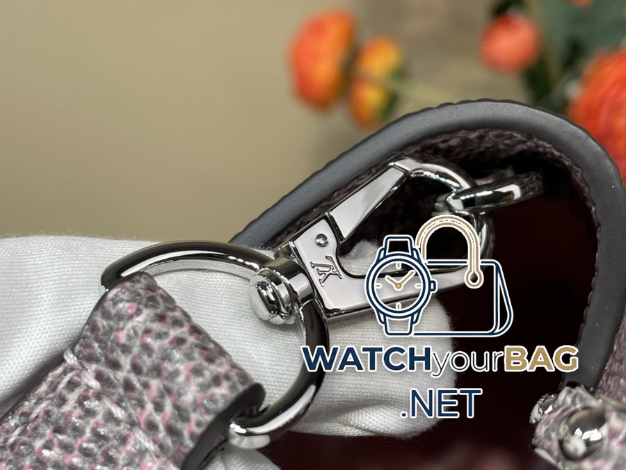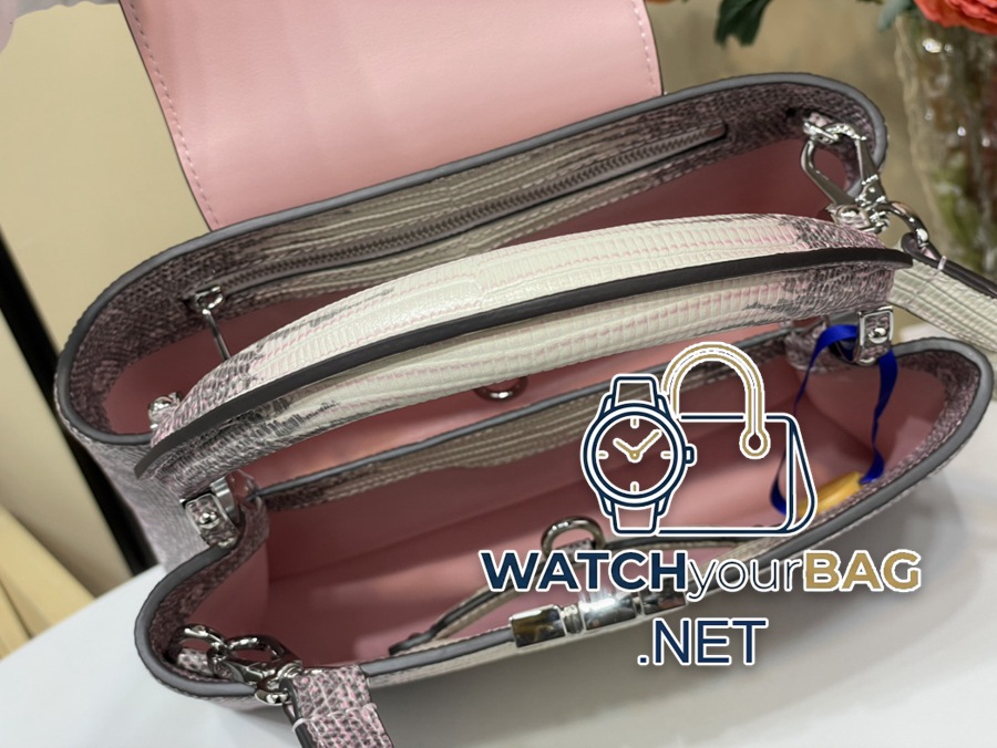 Capucines BB handbag N48865 98177 gradient pink lizard (cowhide pressed lizard pattern) Capucines BB handbag exquisitely combines elegant lizard skin outer layer, delicate sheepskin lining and glossy metal parts. The iconic flip cover achieves two styles: the LV logo is read inside, and the Monogram flower blooms outside, with a metal chain⛓, lighting up an eye-catching corner for evening occasions. Size: 27x18x9cm