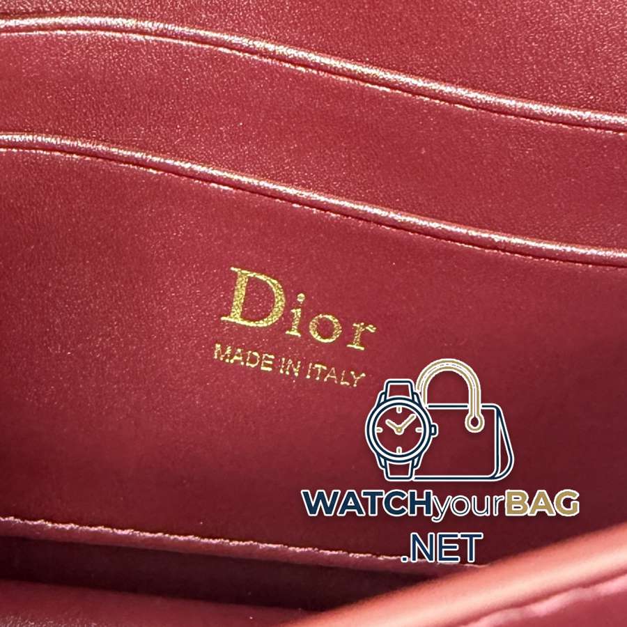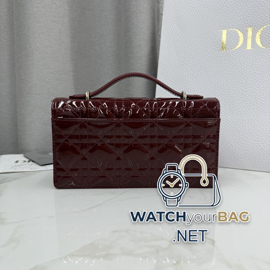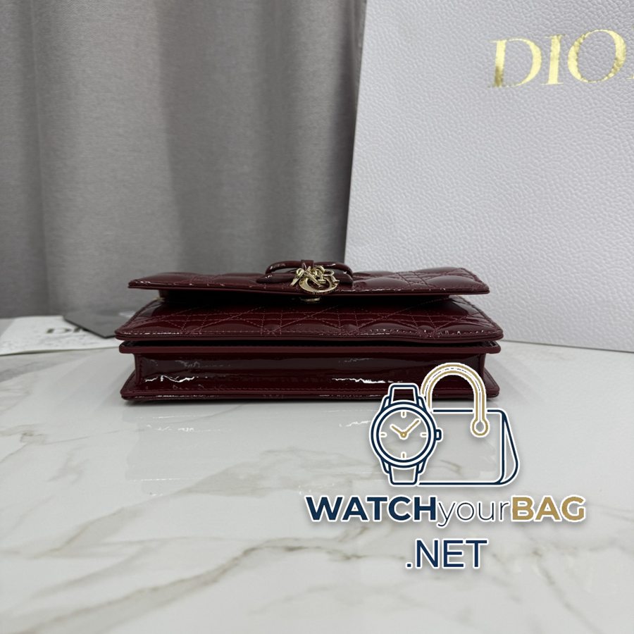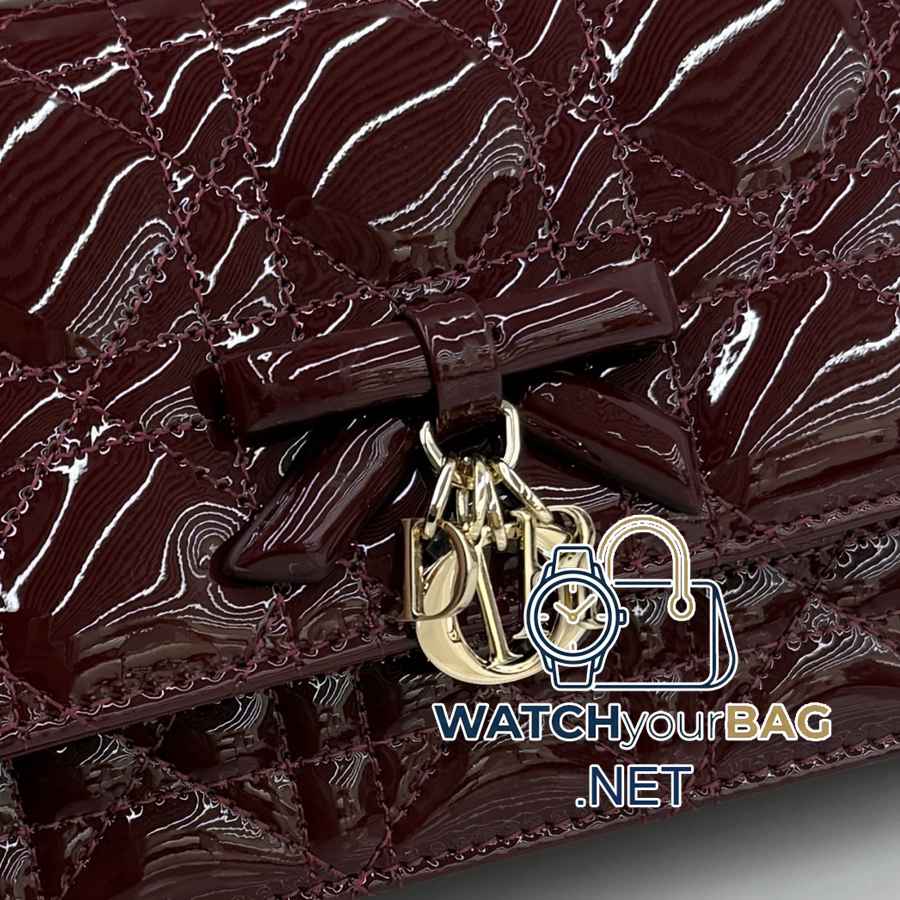 My Dior Mini Chain Bag – Ref.: S0984 – Burgundy Patent Leather Bow This My Dior Mini Chain Bag further enriches the collection with an elegant and practical design. Crafted from burgundy sheepskin patent leather with cannage pattern, the front flap adds style with a decorative leather bow, accented by a metal D.I.O.R. charm with a light gold finish. The practical style has multiple compartments and card slots to store a variety of daily essentials, making it an ideal companion for day and evening wear. Carry by hand or cross-body with top handle and detachable chain embellished with bow links. Decorative bow on front with D.I.O.R. charm Flap closure 2 internal compartments Back slip pocket 3 card slots Foldable leather top handle Detachable chain embellished with beads Made in Italy Number: S0984 Dimensions: 21 x 11.5 x 4.5 cm (L x H x W) Holds 1 mobile phone, 1 card holder and lipstick Chain length: 110 cm Length from top of chain to top of bag: 51 Weight in cm: 400 g Dimensions and weight details may vary depending on product material