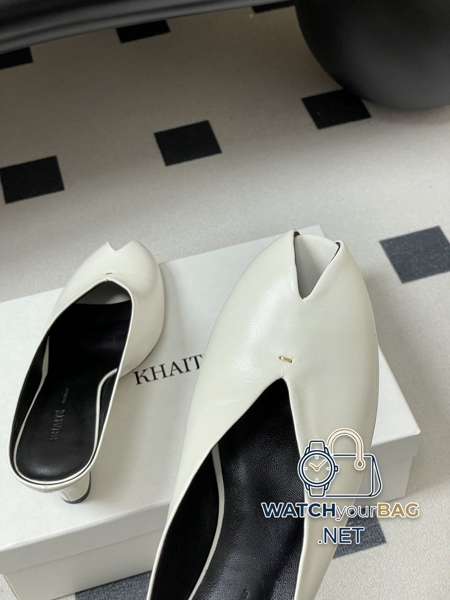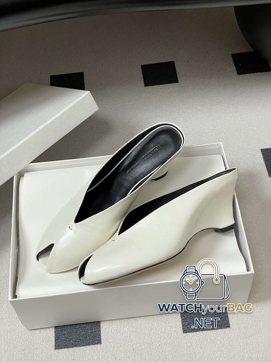 Khatie 2026s Spring and Summer New Retro Fish Mouth Shaped Heel Mules Shoes Toe-Toe High Heels Half Slippers Wedge Sandals Shaped Heel Mules | The Pioneer Expression of Minimalism As a representative of American light luxury, Khaite integrates the iconic architectural shaped heels into the Mules. The delicate texture of the cowhide is matched with the simple tailoring of the fish mouth, breaking the laziness of traditional Mules. The shoe body does not have too many decorations but uses lines to outline the brand minimalist aesthetics. The low-heeled version combines comfort and design. It is suitable for various scenes such as afternoon tea, urban commuting, and art exhibitions. Paired with acetate satin wide-leg pants, it is a cool urban elite style. Paired with a knitted slit skirt, it can be worn with a casual, modern and relaxed feel. Upper: Cowhide lining. Foot: Sheepskin. Sole: Italian leather outsole. Heel height: 7.5cm. Size: 35-39 (40.41 custom-made, non-refundable)